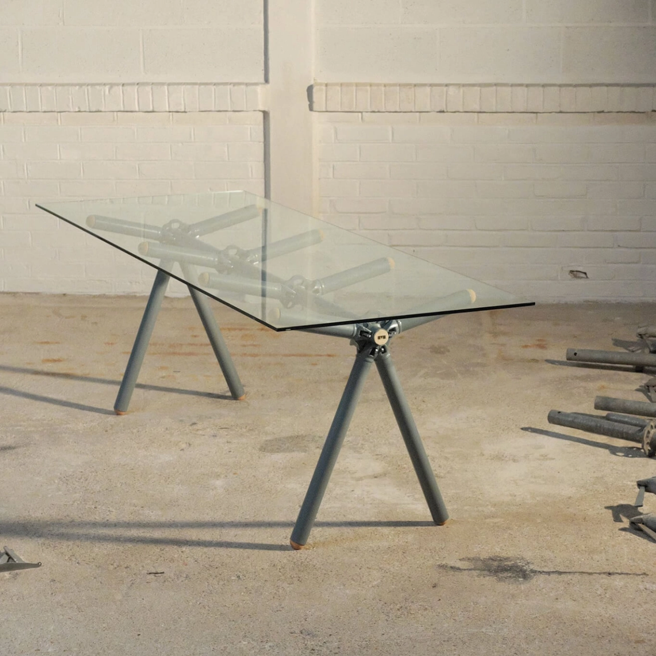 A custom-made project is the only solution to save the Altrad-Plettac scaffolding fleet from a compromised future… and this is where the Clavex table available in 3 sizes (for 6, 8, or 10 people) comes into play. After years of rental, these scaffolds are no longer suitable for supporting a worker at height, but they retain all their structural qualities when used on the ground. It is with this in mind that Maximum sees an opportunity to create a unique piece. A glass partition is cut to fit the space perfectly. This glass is hardened for safety reasons, making it impossible to cut again. When removed, these glass panels, even in perfect condition, inevitably end up at the recycling center. Due to their fixed dimensions, their reuse becomes a challenge. The epoxy paint used is a powder sprayed onto the steel parts before being baked at 200°C. During this process, part of the powder also spreads onto the glass panels. Once the application is complete, part of this powder is sucked into the recovery circuits, where it mixes with the residues in the tanks. The resulting mixture is fully reusable, although each color obtained is unique and unpredictable.