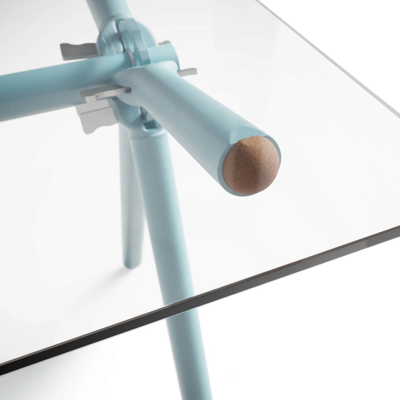Powder-coated steel, cork, tempered glass, matt chrome-finish keys