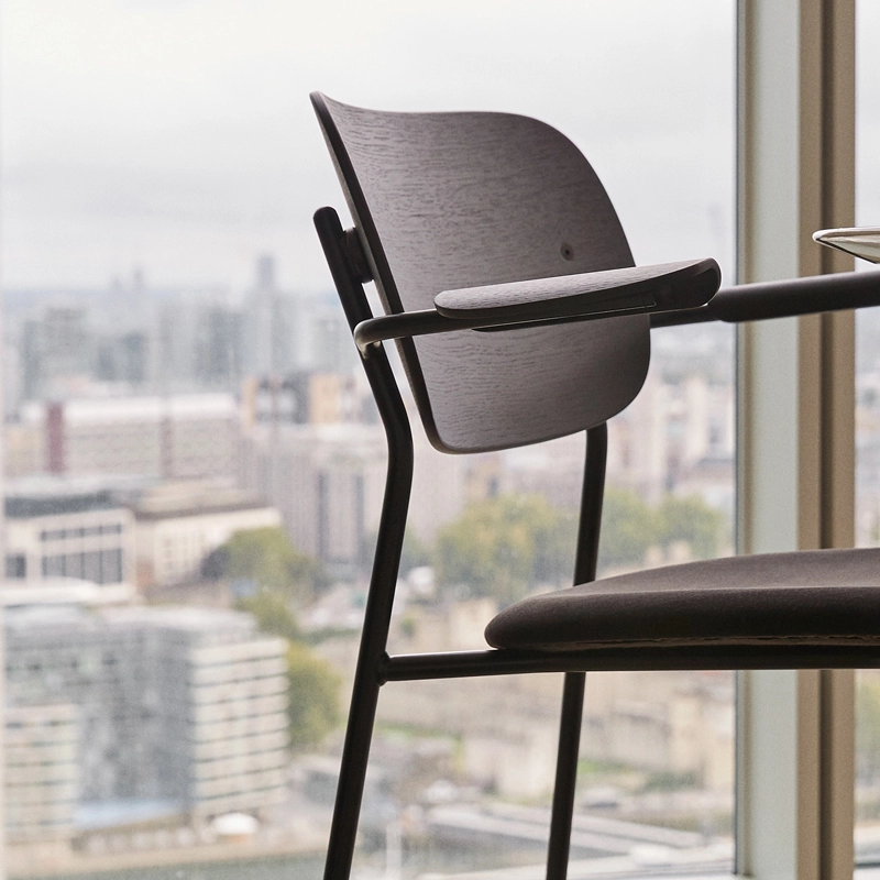 "Together", "mutually", "in common": the words that define the "Co" prefix are the heart of the Co Chair. Designed in collaboration with the Office Group and Norm Architects, this multifunctional chair adapts to a wide variety of needs and styles of space. It suits the needs of both public and private environments, making it as attractive in a dining room as it is in a conference room. Edited by Menu, the chaise Co Chair combines a lightweight silhouette with great seating comfort. In addition to these features, they can be stacked in towers of up to 15 chairs. Visually, the contoured shape and warm materials are typical of Norm Architects. The version with armrests provides additional comfort and enables the chair to be hung on a table for easy cleaning.