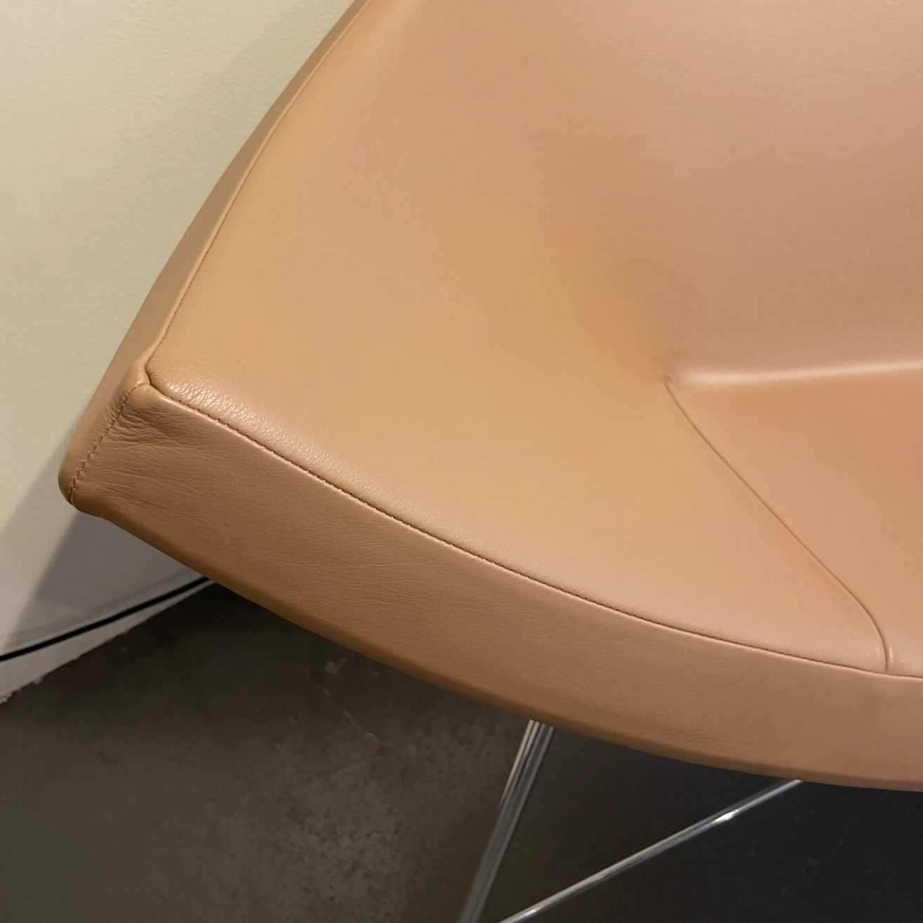Designed by George Nelson for Vitra, the Coconut is a second-hand armchair that perfectly embodies the design spirit of the 1950s. It is characterized by a playful silhouette and pure, graphic forms. George Nelson often compared this piece to a coconut split into eight sections. He deliberately reversed the usual colors of the Coconut, with the outer shell made of white synthetic material and the single-piece foam padding covered in black leather. The leather is slightly creased on one corner of the seat, though this does not affect the chair’s aesthetics or comfort in any way. Vitra produces the second-hand Coconut lounge chair, welcoming and comfortable, inspired by nature, allowing you to sit in any position you like—whether in the living room, bedroom, or office.