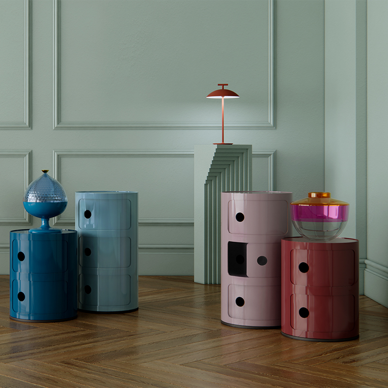 These modular storage units, known as Componibili, created by Anna Castelli Ferrieri in 1968, have been designed to meet a variety of use requirements and so find their place in every room of the house: the bathroom, bedroom, kitchen or living room. Well thought out, the Componibili modular units meet a legitimate need for storage and can be adapted to any use. The key idea is the elementary but solid superimposition of the various Componibili blocks, which, by simply fitting together, make up highly practical storage units. This moulded plastic cylinder, with its sober, functional lines, symbolises the breakthrough in design that took place in the 1960s. The storage furniture Componibili will quickly become a growing success thanks to its extreme functionality. Democratic, accessible and bold, Componibili responds fully to the needs of a new society taking shape. Componibili by Kartell so meets a variety of use requirements, and is available in seven different colours. An iconic object from Kartell, Componibili has been making its mark ever since its debut at the Milan Furniture Fair in 1927. Flexible and functional, Componibili has been produced for over thirty years and has received multiple accolades for the value and innovation of the project. The Componibilis are exhibited at the Museum of Modern Art in New York and the Centre Pompidou in Paris. Thanks to Kartell, plastic has become precious, noble and refined.