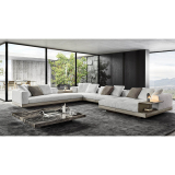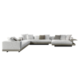 Connery demonstrates a unique personality. The geometrical nature of the base creates an original contrast with the soft seat, as well as the structure of the back and armrests. The back forms a single volume with the armrest featuring by a 45° slot in the corner. The upholstered structural base, as well as the fabric covers, can be adorned with in leather strips fabricated using a luggage making technique This concept of high-end leather goods is also found in the headrests and in the elegant "C" Flap shelves which are harmoniously integrated into the seating elements offering great dynamism when it comes to arrangements. On the front, thin, glossy, brandy-coloured metal plates lift the structural base off of the ground. In addition to enhancing the sofa's beauty by evoking the metallic parts of suitcases and trunks, they also confer a feeling of lightness.