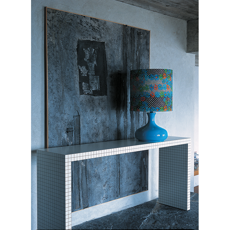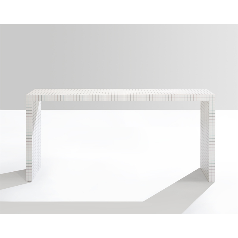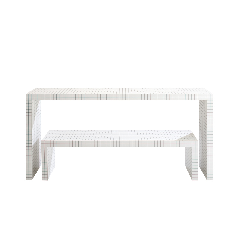 The products in the Quaderna collection are the result of a highly industrialised process and at the same time great craftsmanship. The tile laminate has been specially created based on Superstudio's design and features a 3 cm grid, produced using digital printing. This laminate is then applied by hand, requiring great precision and several hours of work for each piece. The convergence of the lines in the pattern creates a homogeneous surface, giving the furniture a strong personality.