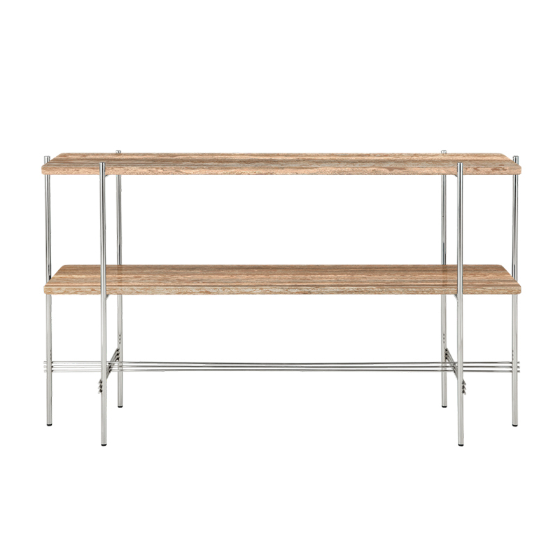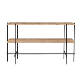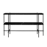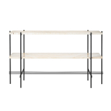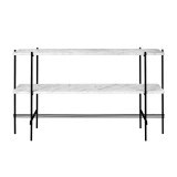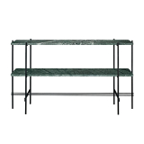 The collaboration between the GamFratesi studio and the Gubi brand embodies the convergence of Italian design and Danish inspiration. The minimalist approach and the traditional craftsmanship of the Scandinavian countries are combined with a strong and emotional concept. GamFratesi plays on contrasts of materials and shapes with a marble or coloured glass top resting on a thin black or brass metal base. Graphic and elegant, the TS console from Gubi brings a touch of elegance to a living room or hallway. The TS collection is also available as a coffee table, pedestal table, dining table and desk.