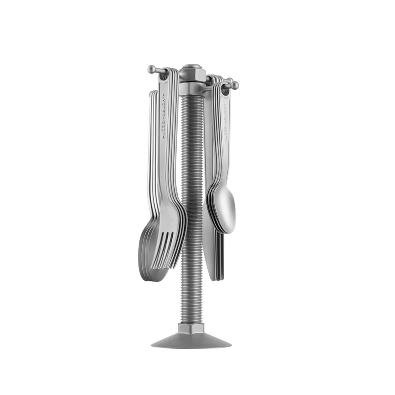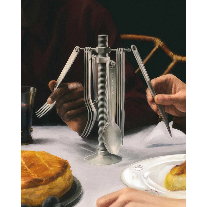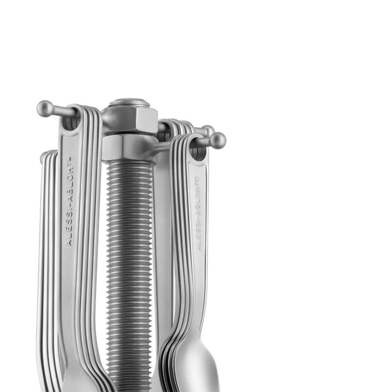 The Conversational Objects cutlery service published by Alessi stands out for its original appearance. Virgil Abloh's essential housewife merges the final product with the mechanical tools typical of his production, in a formal short-circuit imbued with poetry. Now in the truest sense of the word, these are convivial tools used to start conversations and build social relationships during meals. Placed in the middle of the table, the cutlery tray allows you to play informally with the table setting by giving each guest the opportunity to serve themselves.