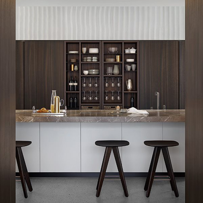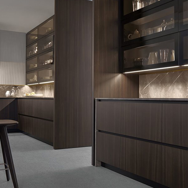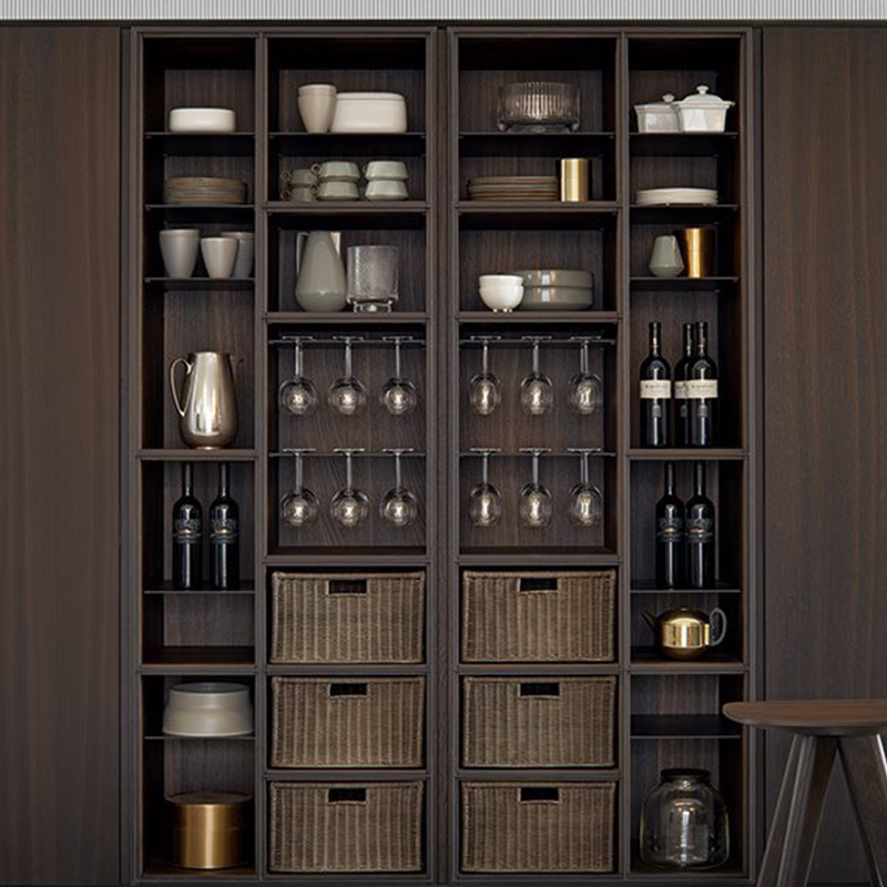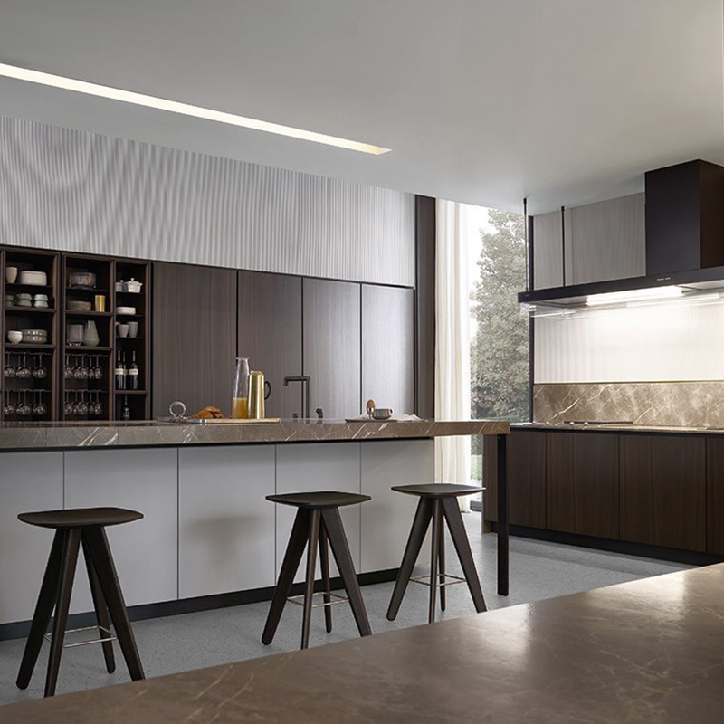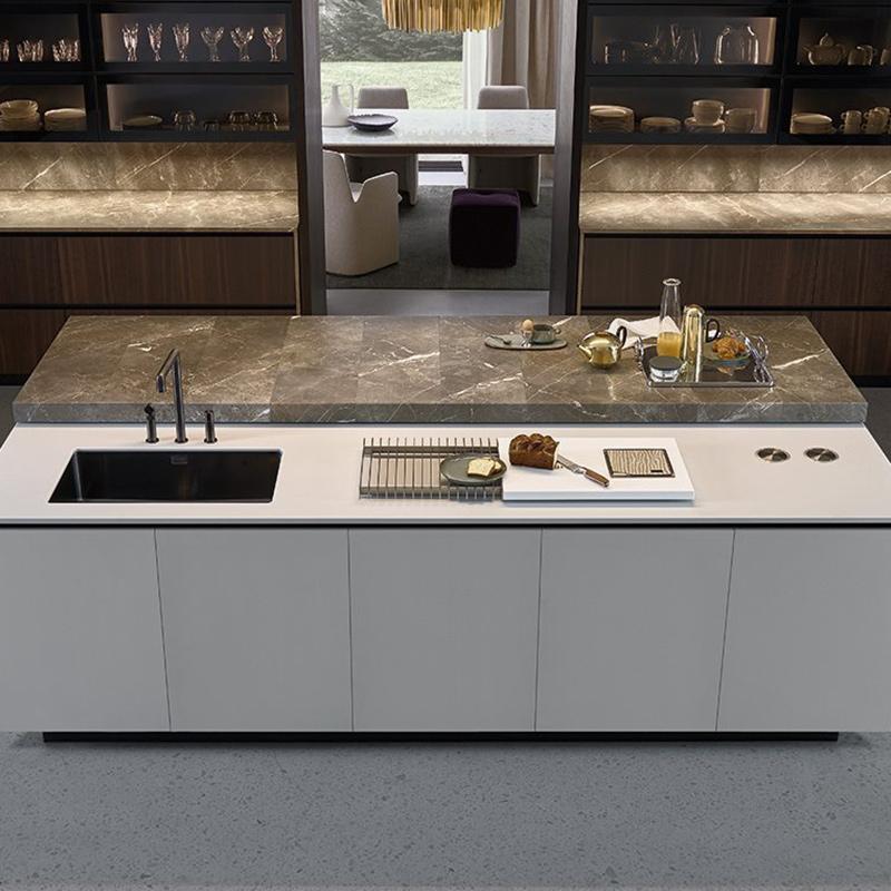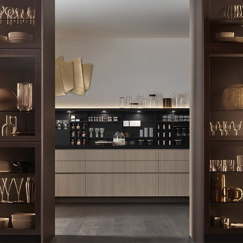 Poliform is linked to the strong thickness of the lines that characterise each composition, each element, becoming once edge, once frame, once structure. The storage elements, the work surfaces, built against the walls or in islands become true geometric "solid", surfaces that emphasise the high-quality of their raw materials. Contact us for more information.