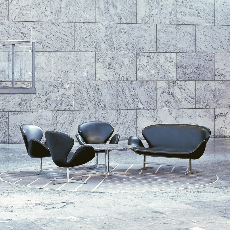 Arne Jacobsen designed the Swan and Egg armchairs for the lobby and reception of the Royal Hotel in Copenhagen. This project allowed Jacobsen to conceive a global project, integrating architecture and furniture design. In 1958, the Swan chair was a technological feat produced by Fritz Hansen, created using curves alone and no straight lines. The shell is moulded in synthetic material and padded with polyurethane foam; the base is made of polished aluminium. It is available in leather or fabric. Swan is ideal for public areas as well as for household living areas, it can be placed near to the fireplace on winter evenings, or even in your bedroom.