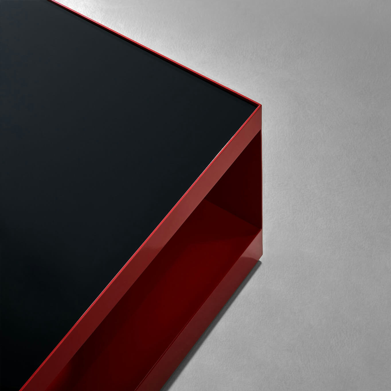 Cut and folded steel sheet structure, completed with a particle board panel at the back, glass top, black or transparent tempered glass or transparent reinforced glass, casters concealed under the structure.