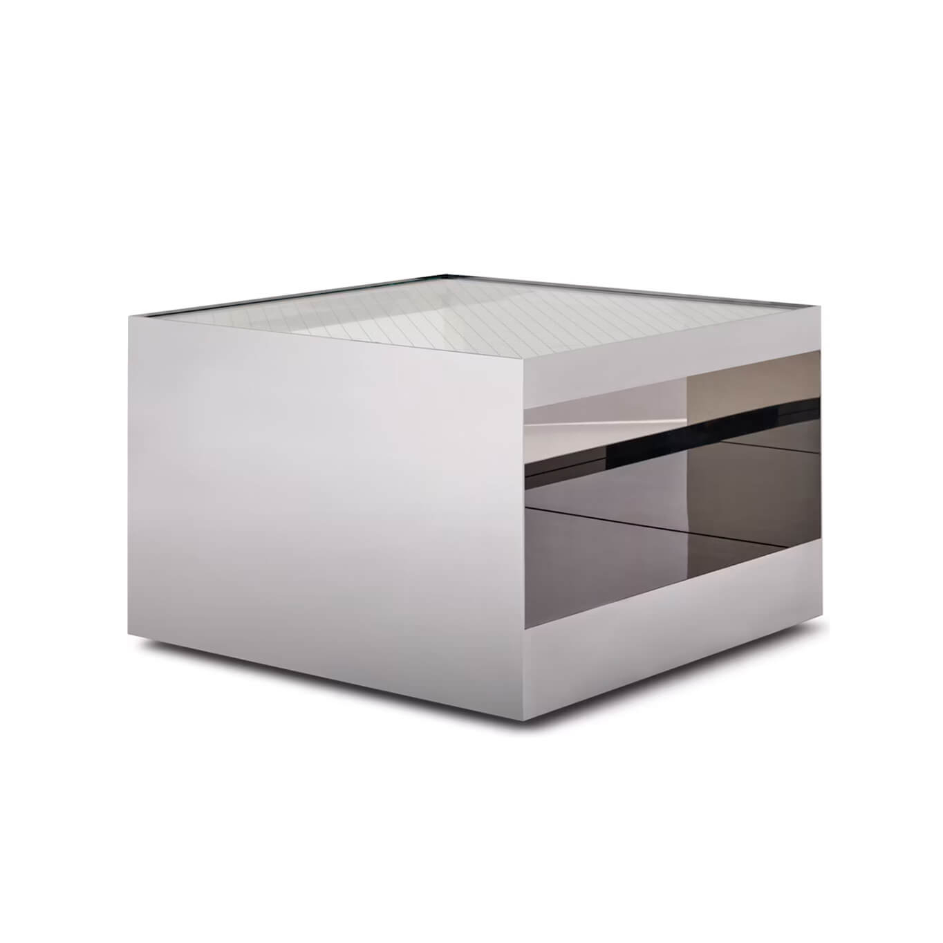 Designed in 1980, the D’Urso Occasional Table embodies the high-tech design movement through its utilitarian aesthetic, use of industrial materials, and hidden casters. Its two-tier structure features a lower shelf that provides additional space to store or display books and objects, while keeping the top surface clean and uncluttered. “The items below remain visible—they're highlighted without being in the way,” explains renowned interior designer and minimalist Joseph D’Urso. Crafted from welded steel, this table stands out for its durability and its polished, glossy finishes. The concealed wheels make it easy to move the table as needed. The open lower shelf functions as a second tabletop, while the reflective surfaces pick up surrounding objects and help the table blend seamlessly into its environment. Available in various sizes, it can be used as either a coffee table or a side table.