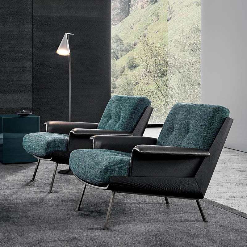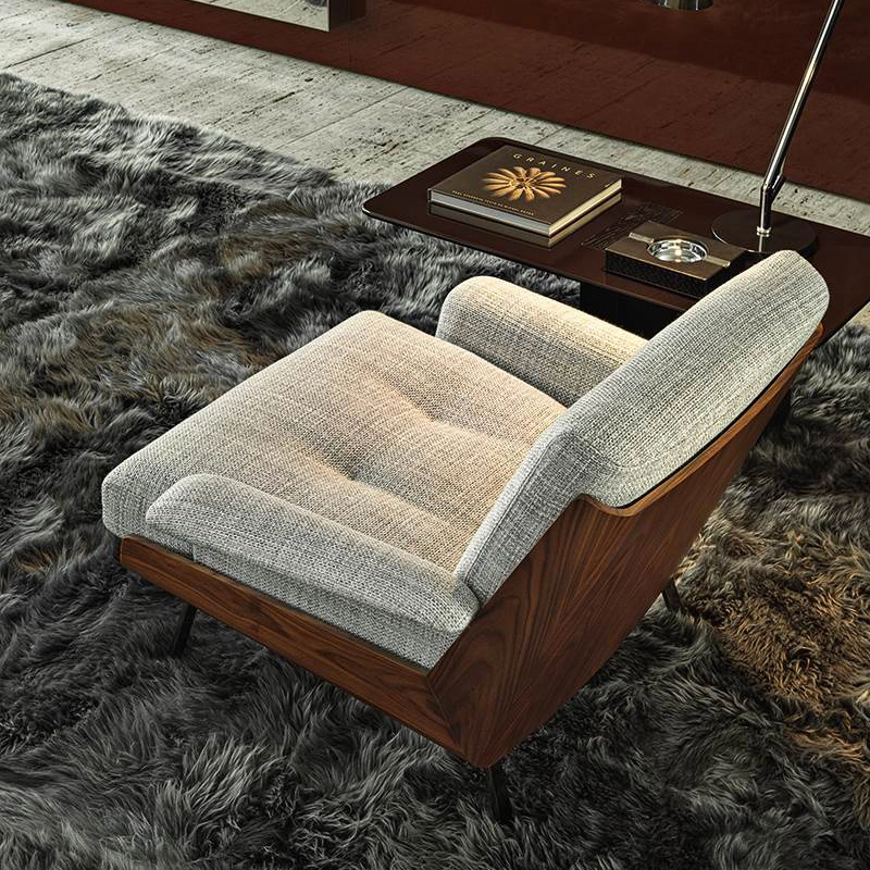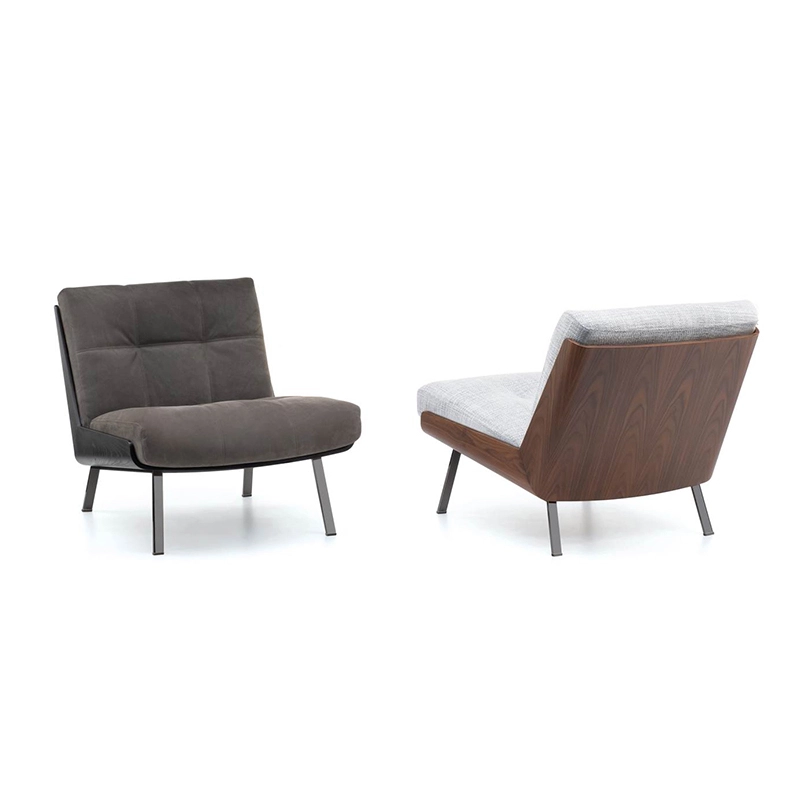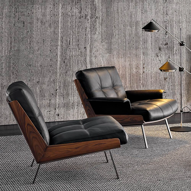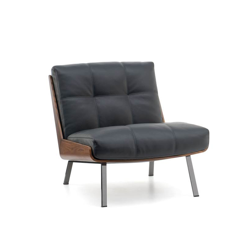 Inspired by his many trips to Japan, the Daiki chairs are born of Brazilian architect Marcio Kogan's passion for Japanese culture. The collection includes deep-seated armchairs with or without armrests, as well as a footrest. The curved hull is the result of sophisticated woodwork and consists of two elements joined at 45°, to create a sloping back ensuring a comfortable seat. Made of Santos rosewood or liquorice-coloured flamed ash veneer, the hull is the perfect home for the cushions, resting on a metal frame with Black-Nickel legs. In the leather model, the cushions feature quilt-effect stitching. The cushions on the fabric variant only have top-stitching. Edited by Minotti, Daiki also explores and reinterprets American Mid-Century Modern atmospheres through its clean, crisp lines, high-end materials and balanced proportions.