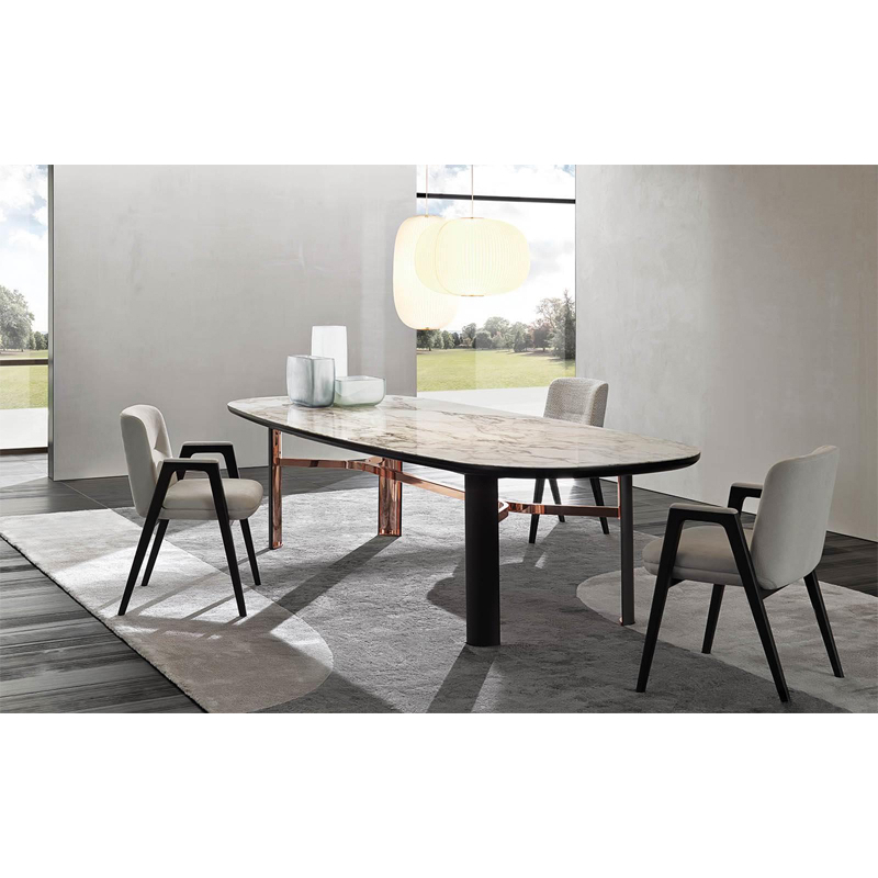Minotti with the creativity of Christophe Delcourt, taking the circle as its starting point. Like an artist, the designer has deconstructed the form to investigate its expressive possibilities. Rounded and concave legs connected by a crosspiece define the base and enhance the overall design of the table. The contrasting finishes of the legs create an interesting play of light, illuminating the area underneath the tabletop – a space usually in the shade. The edge of the