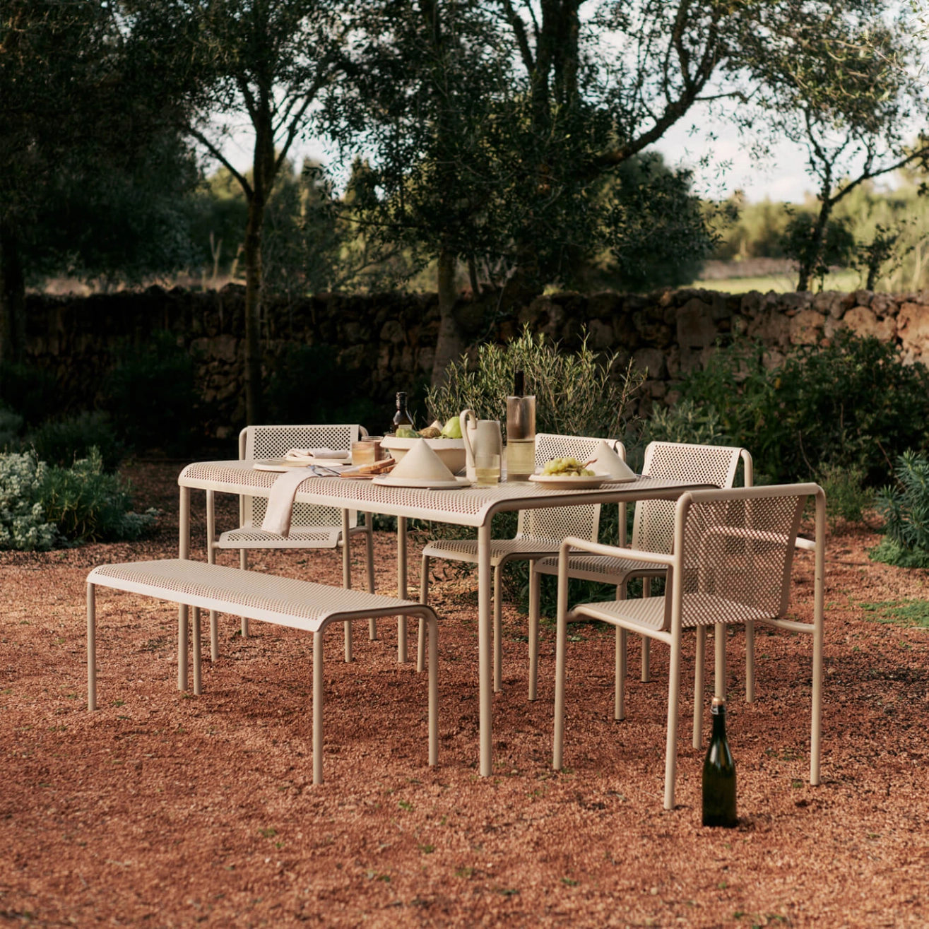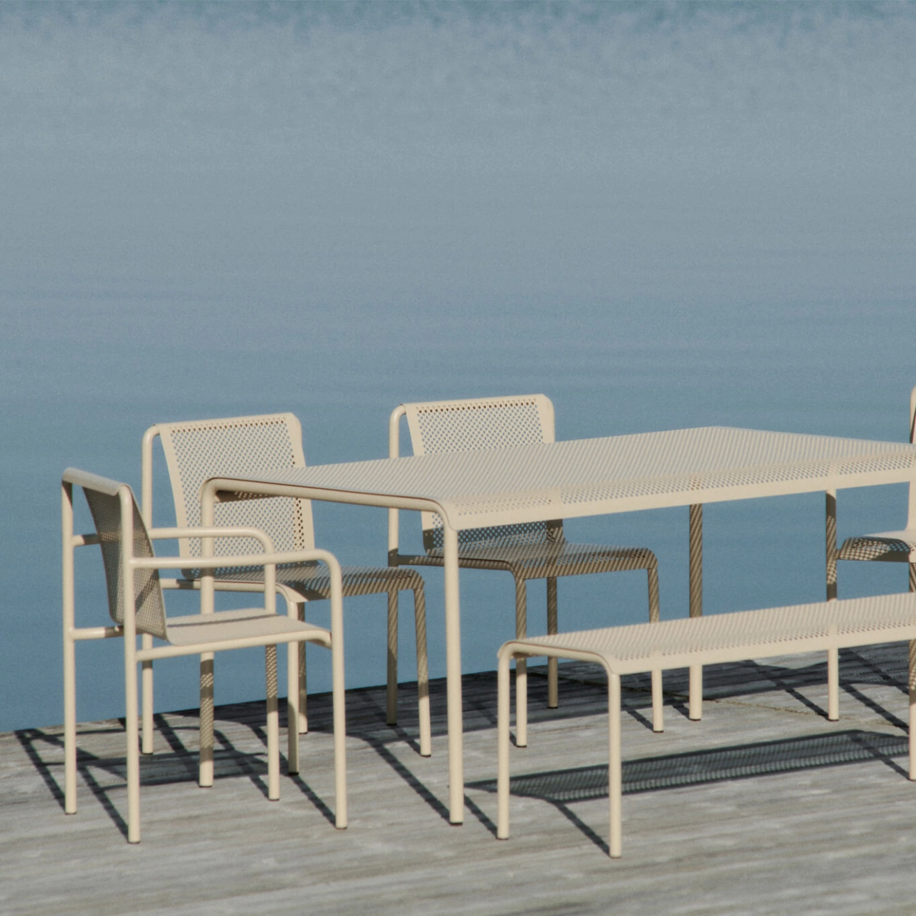 Inspired by the beauty of sunlight filtering through the leaves, the Dapple collection brings a sense of serenity to outdoor spaces. The Dapple Bench is made from galvanized steel with a powder-coated finish, ensuring durability and protection against the elements while maintaining an elegant aesthetic. With its light, airy shape and distinctive perforated pattern, the Dapple Bench is both practical and stylish.
