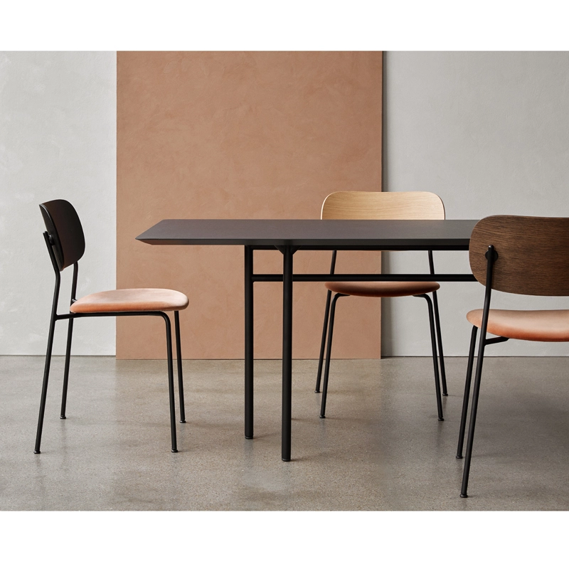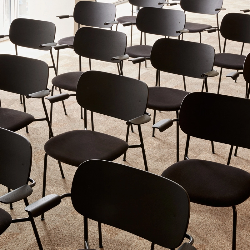 "Together", "mutually", "in common": the words that define the "Co" prefix are the heart of the Co Chair. Designed in collaboration with the Office Group and Norm Architects, this multifunctional chair adapts to a wide variety of needs and styles of space. It suits the needs of both public and private environments, making it as attractive in a dining room as it is in a conference room. Edited by Menu, the chaise Co Chair combines a lightweight silhouette with great seating comfort. In addition to these features, they can be stacked in towers of up to 15 chairs. Visually, the contoured shape and warm materials are typical of Norm Architects. The version with armrests provides additional comfort and enables the chair to be hung on a table for easy cleaning.