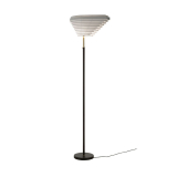 Floor Lamp was designed by architect and designer Alvar Aalto in 1954. Produced by Artek, the lampshade is made of hand-riveted brass strips painted in white. These thin strips of painted metal prevent glare and give off light evenly. The lampshade's asymmetrical shape is reminiscent of an angel's wing. The base and stem of the Floor Lamp are upholstered in black leather, and the 250cm-long cable is made of white plastic. It provides soft, warm light in living rooms and bedrooms.