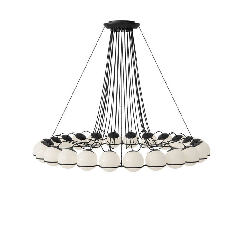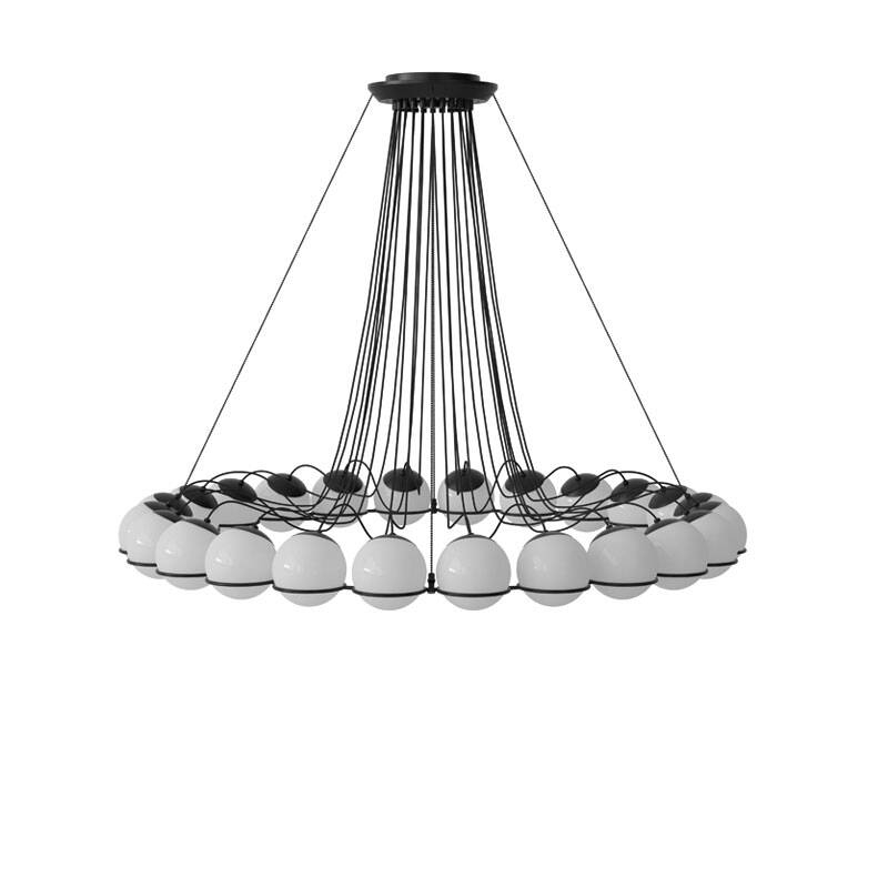 The suspension 2109 features a circle of opal blown glass spheres on a black or champagne steel structure. The spheres can be oriented upwards or downwards to provide direct or indirect light. A chandelier that lends itself to a wide range of applications, from domestic environments to public spaces.