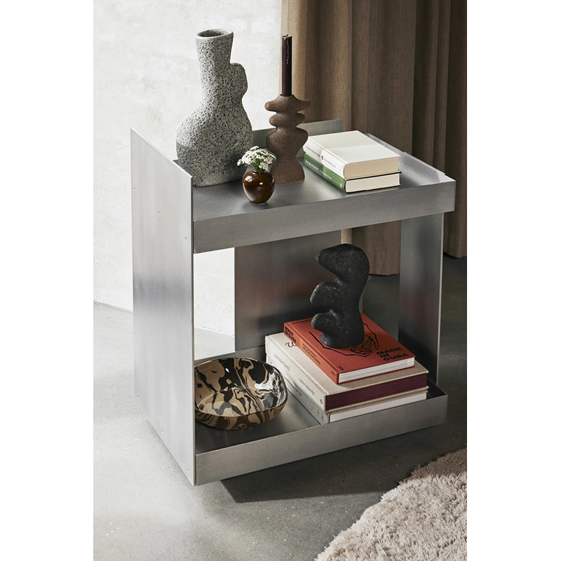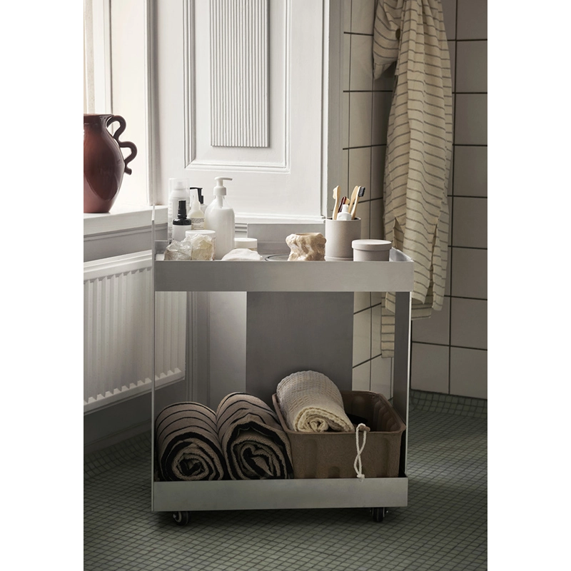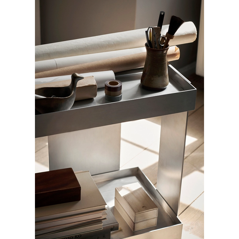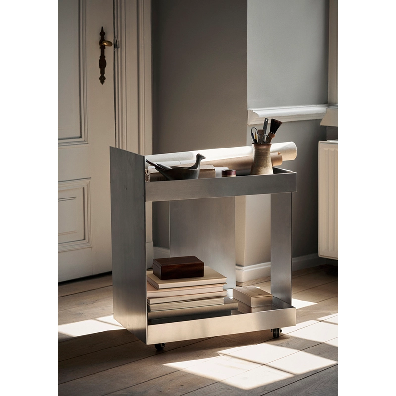 The Lager serving from Ferm Living, named after the Danish word for "warehouse", is inspired by the raw, industrial aesthetic associated with brutalism. This aluminium trolley is a functional piece for interior spaces. Lager can be used as a side table, a versatile occasional table or as a practical storage solution. The raw geometric design of the Lager servingFerm Living features four wheels, offering effortless mobility and allowing easy movement as required. The desserte Lager embodies the alliance of form and function, adding character through its brutalist style and use of aluminium.