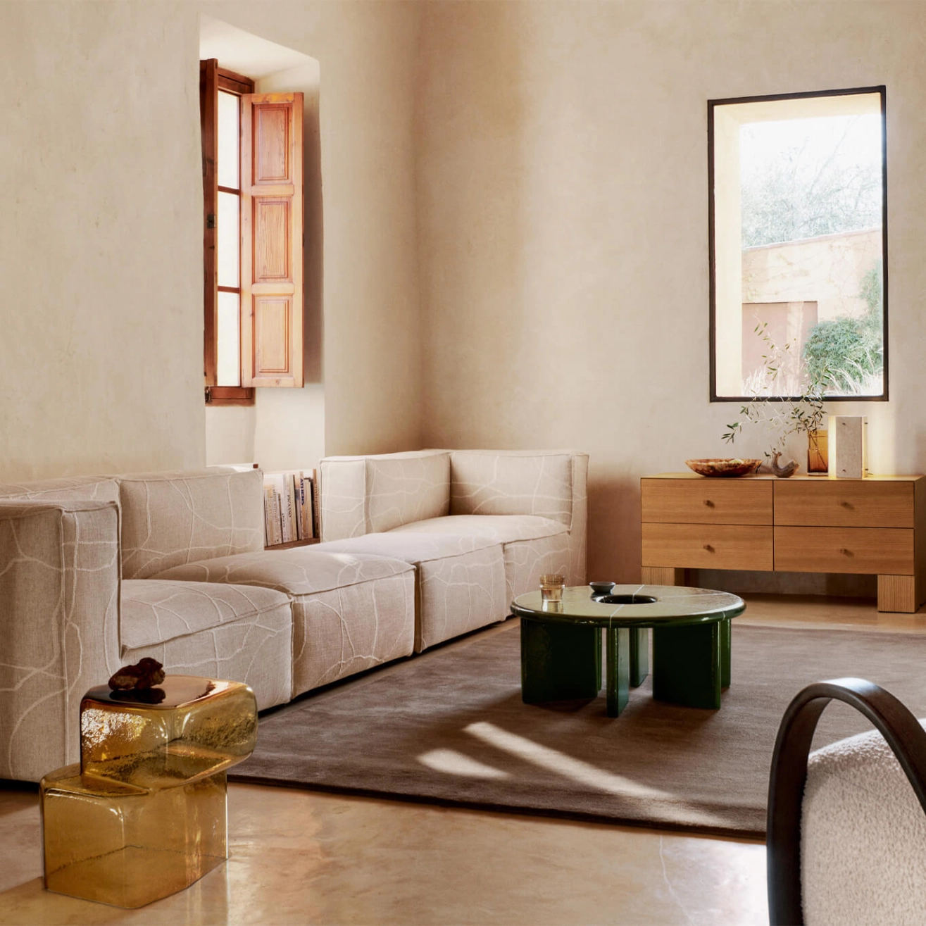 Made from fiber-reinforced concrete, the Deya Ferm Living coffee table astonishes with its dark green glaze and irregular texture, accented by lines of off-white plaster. ... Learn more