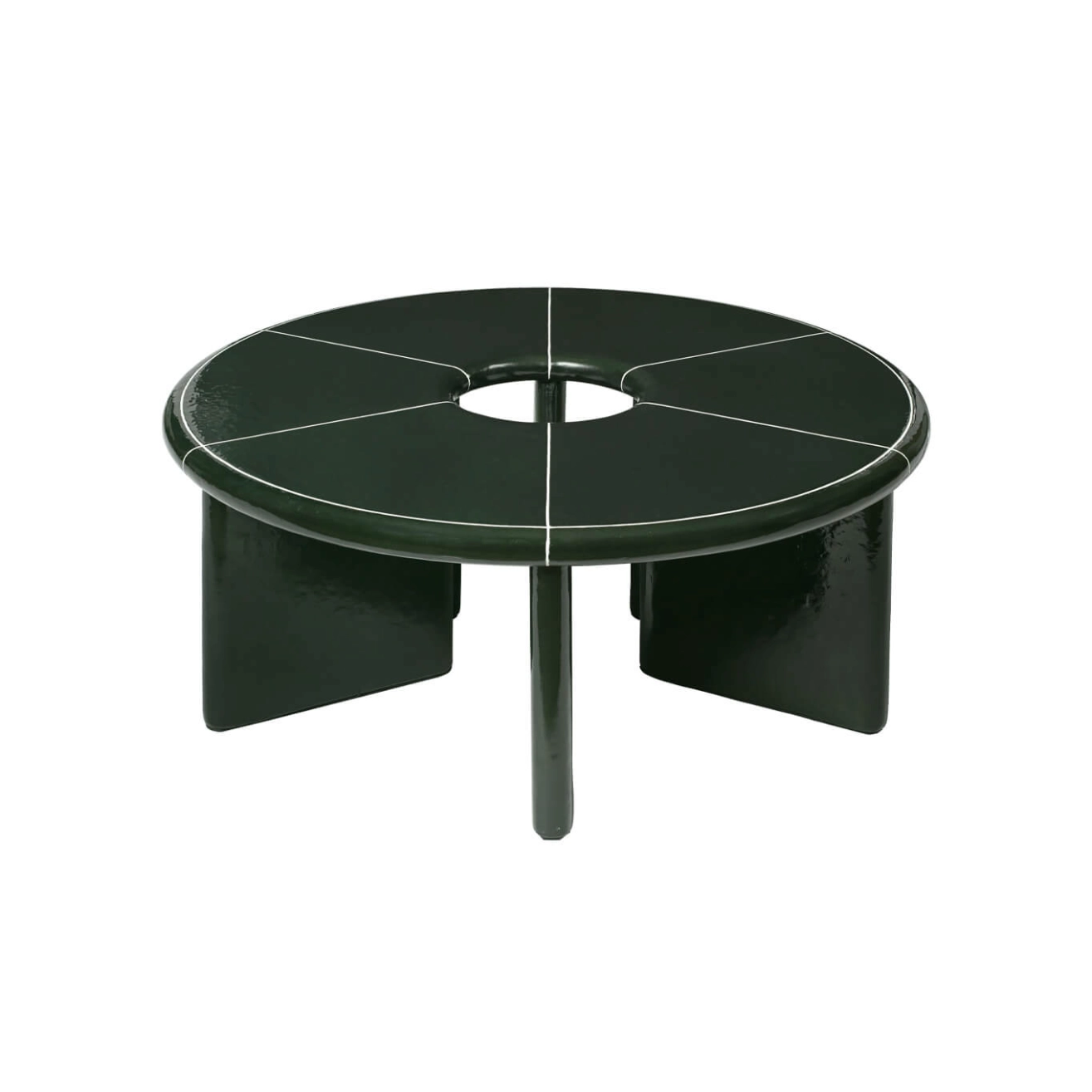Made from fiber-reinforced concrete, the Deya Ferm Living coffee table astonishes with its dark green glaze and irregular texture, accented by lines of off-white plaster. The segmented tabletop features a bold geometric design, complemented by generously rounded edges for a softened presence. Combining artisan craftsmanship and bold geometry, the Deya Ferm Living Coffee Table is a versatile piece equally suited to indoor and outdoor spaces.