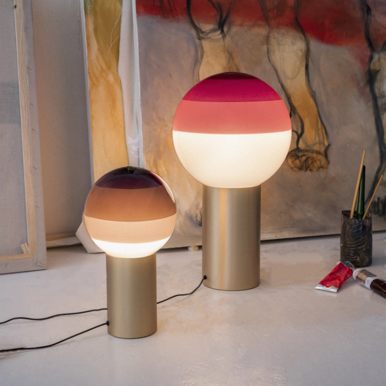 More than a lamp, the Dipping Light invites the viewer to experience illumination as a sensory moment. Designed by Jordi Canudas and produced by Marset, the Dipping Light turns light itself into an evocative visual composition. When switched on, its successive layers of colour soften the brightness and create gentle halos that bathe the environment in a warm and captivating glow. When off, the Dipping Light becomes a refined sculptural object, its blown-glass sphere revealing a palette of expertly applied shades. This creation originates from an experimental approach by Jordi Canudas, who immersed a lit bulb into paint to observe the chromatic variations it produced. From this process emerged a lamp with a distinctive presence, defined by concentric rings of colour that capture and shape the light to give it a unique radiance. Because each layer is applied by hand, every Dipping Light carries its own character, making each piece truly singular. Set upon a precisely crafted brass base, the Dipping Light offers a harmonious interplay of materials, colours and luminosity. It fits naturally into living rooms, workspaces or bedside areas, bringing a refined artistic touch to any interior. Thanks to the expertise of Marset, this table lamp stands as a statement object that enhances everyday atmospheres with elegance and depth.