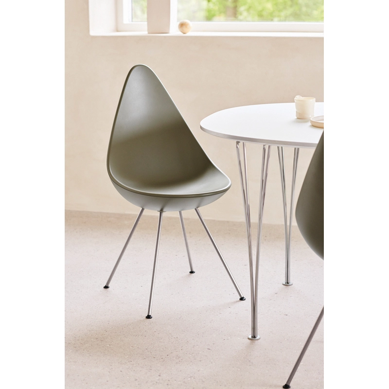 Arne Jacobsen designed the Drop chair in 1958 for his famous Radisson Blu Royal Hotel in Copenhagen. The chair was originally produced with the Swan and Egg armchairs, in limited edition, uniquely for the hotel. After it had been in hibernation for more than fifty years, Fritz Hansen relaunched the uniquely shaped Drop chair. The characterful chair combines a warm shell with great freedom of movement, providing optimal comfort. Available in a variety of colours, Drop adds a touch of originality to the most understated dining rooms.