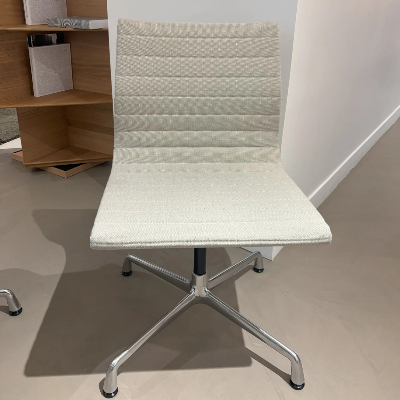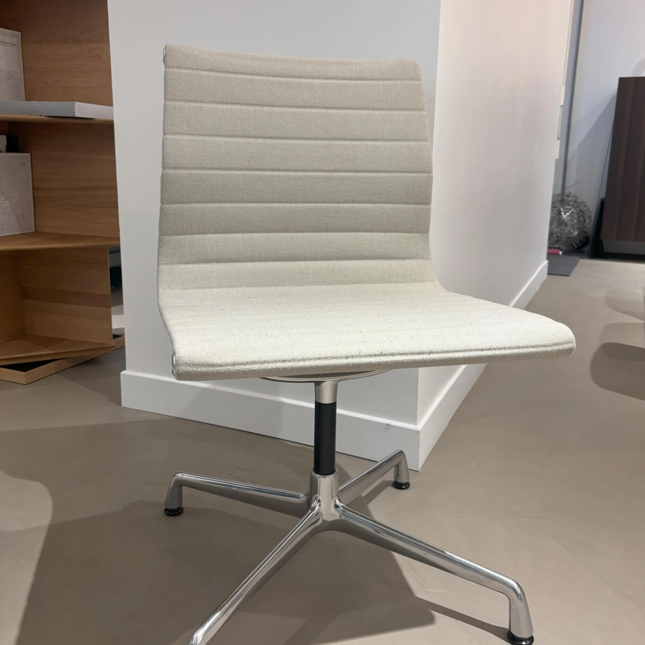 La chaise d'occasion EA 101, conçue par les légendaires designers Charles et Ray Eames pour la marque Vitra, est un symbole du design moderne et intemporel. Élégante et raffinée, cette chaise est reconnue pour son équilibre parfait entre confort, esthétisme et fonctionnalité. Avec sa structure fine en aluminium et son assise tendue, la EA 101 se distingue par sa légèreté visuelle et son allure sophistiquée, idéale pour les espaces de travail comme pour les intérieurs contemporains. Confortable et ergonomique, cette chaise épouse naturellement la posture du corps grâce à son revêtement souple et sa tension parfaitement ajustée. Sa silhouette épurée reflète le savoir-faire d’un design durable et précis, typique du duo Eames. À noter que de petites boules de tissu se sont formées sur l’assise, témoignant d’un usage léger, mais sans altérer l’élégance ni le confort de la pièce. Icône du mobilier du XXe siècle, la chaise d'occasion EA 101 incarne pleinement l’esprit d’innovation et de qualité qui fait la renommée de Vitra.