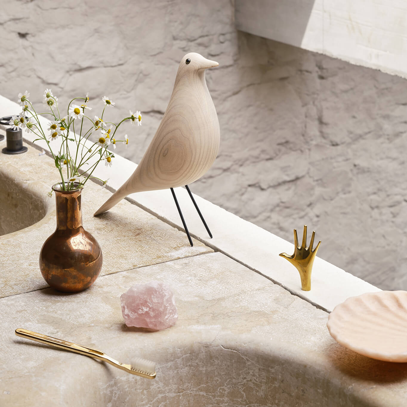 The designer couple Charles and Ray Eames liked to decorate their private home, with many objects and accessories, brought back during their travels. In the middle of their living room, we can find for more than fifty years, a wooden bird sculpture. This charming creation, theoiseau Eames House Bird by Vitra, is not a typical design of Charles and Ray Eames, but it symbolizes their affection for American Folk Art. The Eames House Bird Walnut is a great classic of American design. The Eames House Bird is also available in a black version, edited by Vitra. It is an unusual object for the home, to place on an office or dining table. The Eames House Bird is one of their most prized objects of American popular art. Published by Vitra, this bird with timeless charm is now available in new refined finishes: dark walnut, black ash and Cotton White ash. Three elegant shades that reinvent this symbol of American Folk Art while respecting the original aesthetic imagined by the Eames. Its strong presence has been used many times in their photos as a decorative accessory, inspired by the bird of the Appalachian region in the eastern United States. The Eames House Bird is one of the most popular design accessories for lovers of Eames design and ornithology. By combining the basic design of the bird and the creativity of the Eames family, Vitra has decided to produce this bird in series.