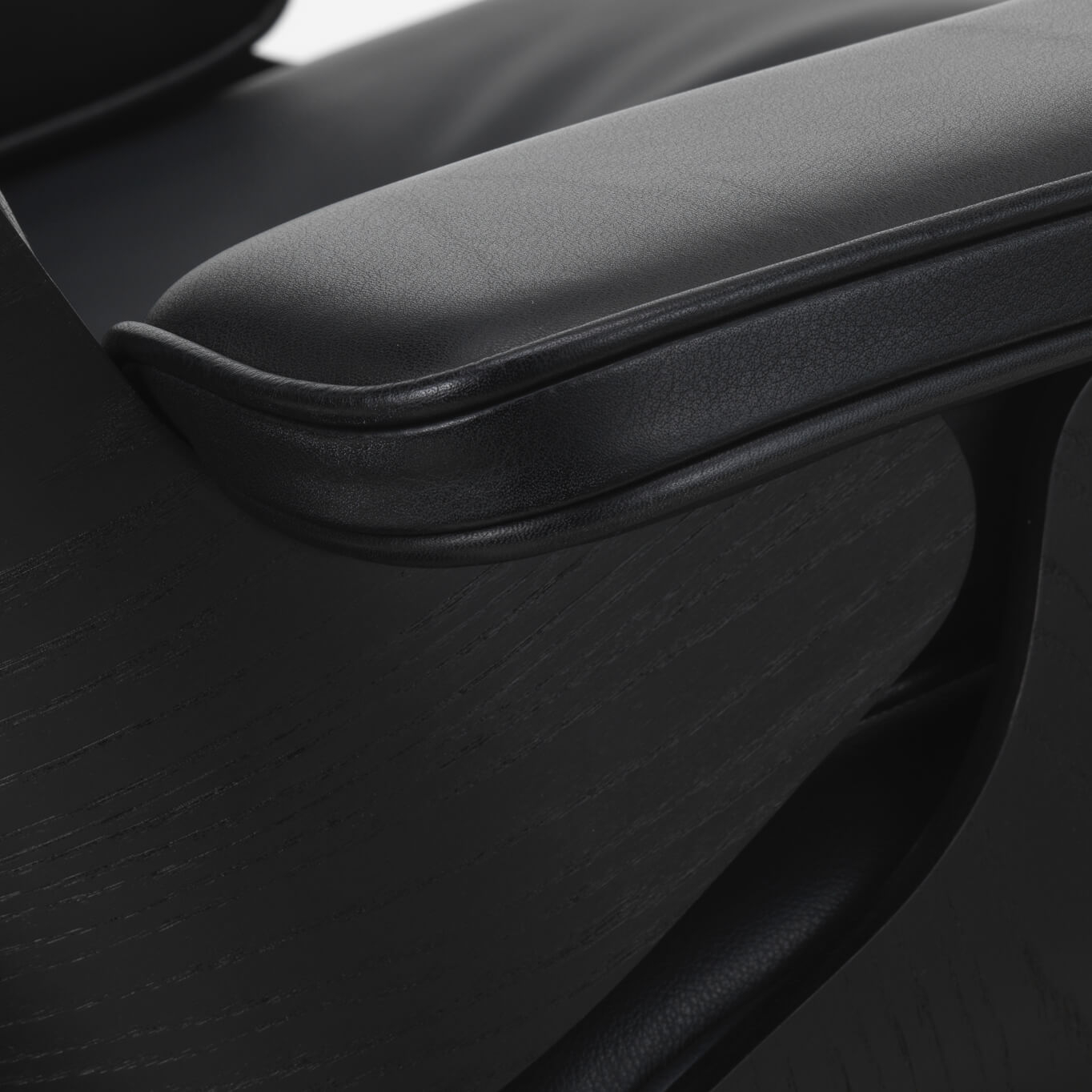 Moulded plywood shell with black chestnut veneer, black powder-coated aluminium base / black sides, removable Premium leather cover, polyurethane foam padding