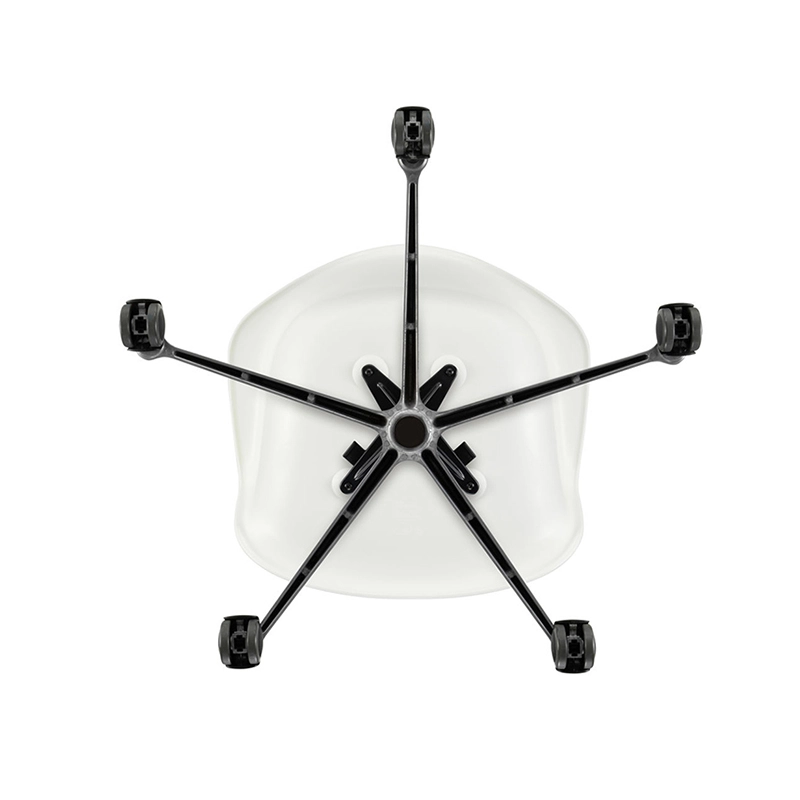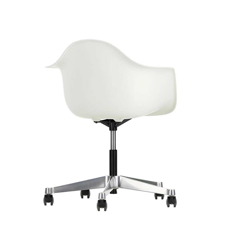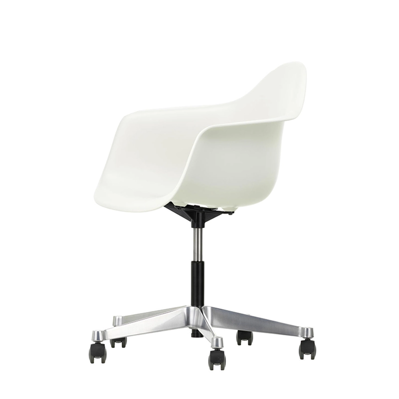 The Eames Plastic Side Chair is the updated version of the legendary Fiberglass Chair by Charles and Ray Eames. Designed in collaboration with Zenith Plastics for the 'Low Cost Furniture Design' competition at the Museum of Modern Art in New York in 1950, it was the first industrially manufactured plastic chair. Published by Vitra, the Eames Plastic PACC (Pivot Armchair Cast base on Castors) armchair has a castor base. The organically designed shell, which ensures excellent comfort, combines with the swivel base to transform the chair into an office chair.