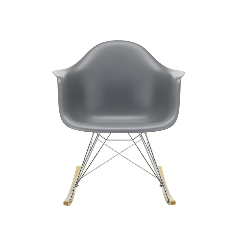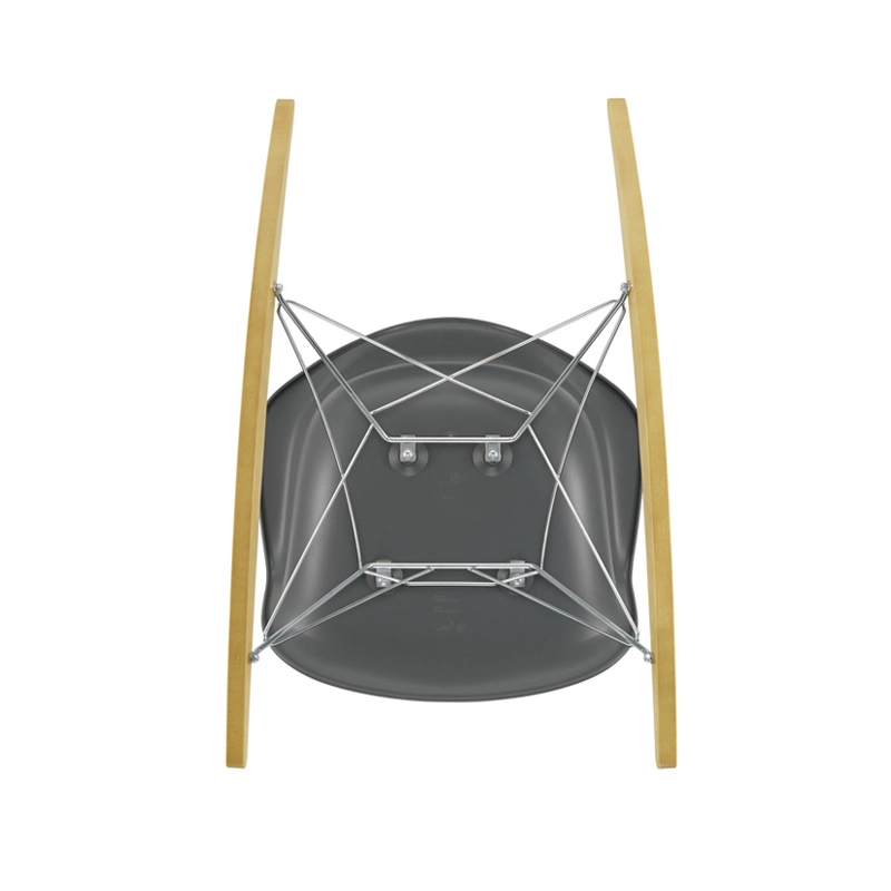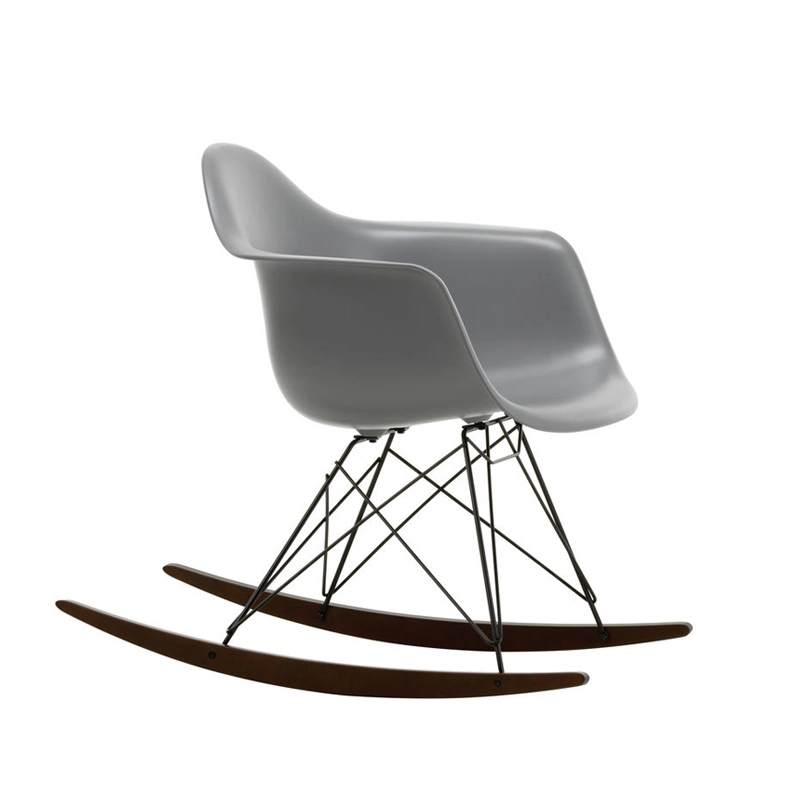 Plastic Armchairs were first presented by Charles and Ray Eames in the "Low Cost Furniture Design" competition organised by the Museum of Modern Art in New York. These small rocking chairs were first produced in 1950. The organically designed shell made of highly comfortable synthetic material was later combined with a range of legs. The shell on this RAR rocking chair model is paired with four legs in steel wire cross-pieces fixed onto two wooden runners. The current RAR Eames Plastic Armchairs (Rocking Armchair Rod base) made of polypropylene offer even greater comfort. Published by Vitra, these cosy, comfortable armchairs are available in a range of colours and will look great in any room in your home.