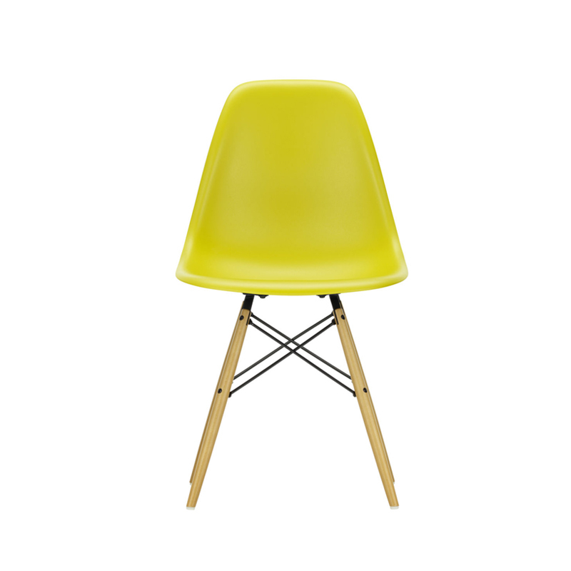 The Eames Plastic Side Chair is the updated version of the legendary Fiberglass Chair by the American design couple Charles and Ray Eames. Designed in collaboration with Zenith Plastics for the 'Low Cost Furniture Design' competition at the Museum of Modern Art in New York in 1950, it was the first industrially manufactured plastic chair. The Eames Plastic Chair DSW (Dining Side chair Wooden base) has a four-legged base in stained and lacquered maple with tubular steel cross braces. The combination of plastic and wood gives this classic design a warm look and relaxed charm. With moulded polypropylene and the new version of the fibreglass models, Vitra has improved the robustness, elasticity and comfort of the Eames Plastic Side Chair DSW. Its polypropylene shell in a range of colours can be combined with three different colours of base to match its environment, whether indoors or out. What's more, its seat shell can be fitted with a seat cushion or full upholstery in a wide choice of fabric colours. The Eames Plastic Chair DSW érable shade of yellow offers a new finish and improved comfort. The organic lines of its shell, which follow the curves of the body perfectly, ensure excellent comfort, making it ideal for use around a table or to accompany a small home office.