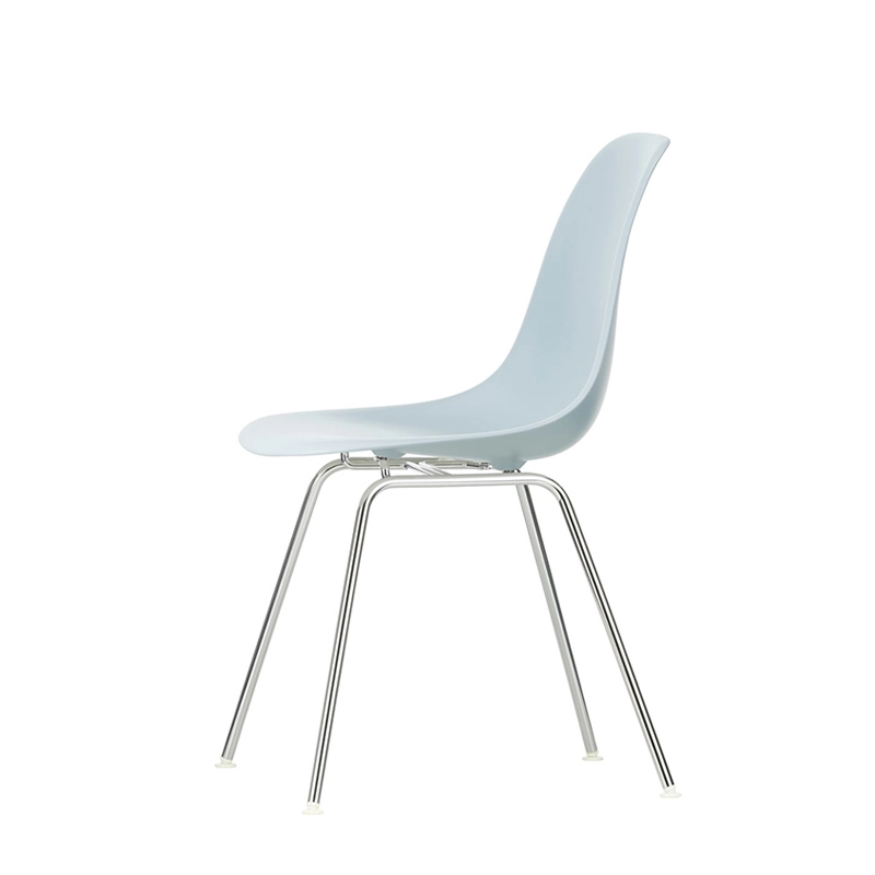 The Plastic Armchairs designed by Charles and Ray Eames in the 1950s were presented for the first time as part of the 'Low Cost Furniture Design' competition organised by the Museum of Modern Art in New York. The shell with its organic lines was originally made of fibreglass. Reissued by Vitra with a polypropylene shell, the chaise DSX (Dining Height Side Chair X-Base) with its sober aesthetic is defined by a four-legged tubular steel base and an organically shaped shell available in a wide range of colours. The base is available in a chrome-plated or black epoxy finish, which is also suitable for outdoor use. The chaise DSX is suitable for both domestic and public environments. By adopting moulded polypropylene, Vitra has improved both its robustness, elasticity and comfort. Starting with a single shell shape, the chair is available in three main families characterised by the shape of the base: the Eames DSR chair with Eiffel base, the Eames DSW chair with wooden lattice base and the Eames DSX chair with simple tubular base. The Eames DSXE chairs are available in several colours, with or without seat cushions or interior padding.