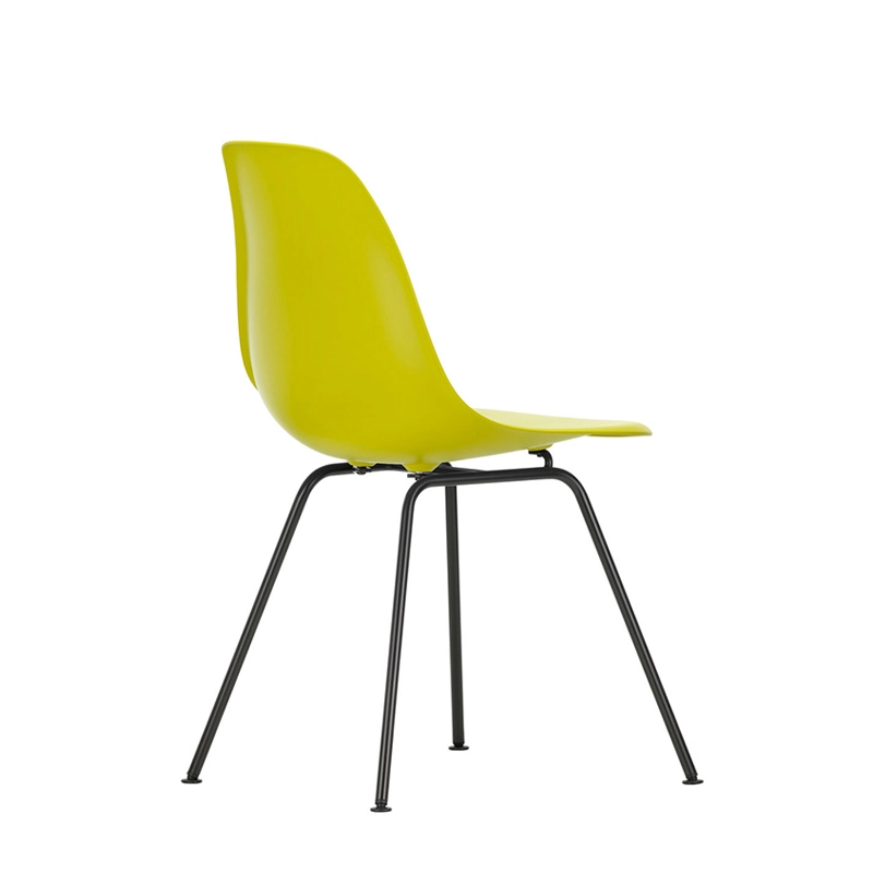 The Plastic Armchairs designed by Charles and Ray Eames in the 1950s were presented for the first time as part of the 'Low Cost Furniture Design' competition organised by the Museum of Modern Art in New York. The shell with its organic lines was originally made of fibreglass. Reissued by Vitra with a polypropylene shell, the chaise DSX (Dining Height Side Chair X-Base) with its sober aesthetic is defined by a four-legged tubular steel base and an organically shaped shell available in a wide range of colours. The base is available in a chrome-plated or black epoxy finish, which is also suitable for outdoor use. The chaise DSX is suitable for both domestic and public environments. By adopting moulded polypropylene, Vitra has improved both its robustness, elasticity and comfort. Starting with a single shell shape, the chair is available in three main families characterised by the shape of the base: the Eames DSR chair with Eiffel base, the Eames DSW chair with wooden lattice base and the Eames DSX chair with simple tubular base. The Eames DSXE chairs are available in several colours, with or without seat cushions or interior padding.