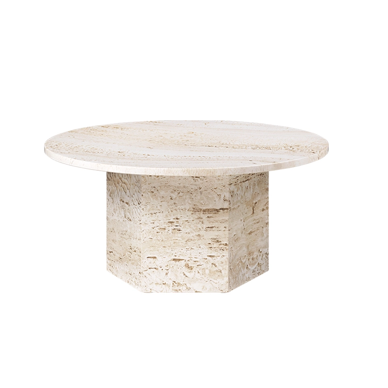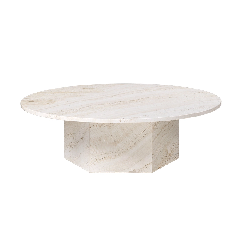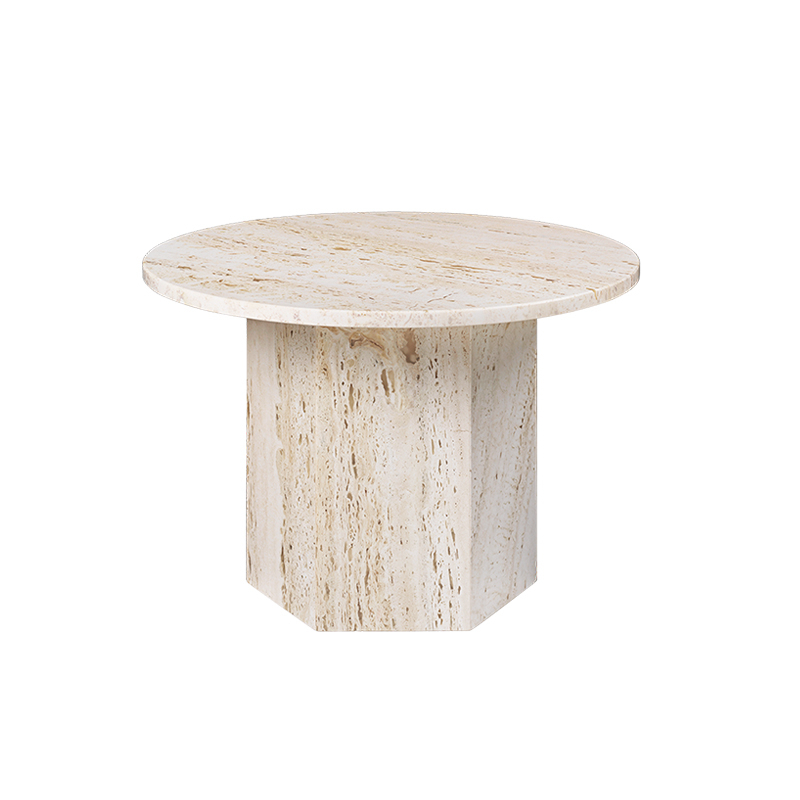 GamFratesi designed the Epic coffee table for Gubi as a sculptural piece of furniture inspired by Greek columns and Roman architecture and named after ancient epic poems. Made in Italy from travertine stone, the monolithic shape emphasises the stone's material characteristics, the natural beauty of its veins and the vibrant texture of its unique patina — in which a new detail can be discovered with each use. Inspired by historic examples of travertine construction such as the Colosseum and St Peter's Basilica in Rome, and by the revival of the material in southern Europe in the 1970s, the Epic table combines two simple geometric shapes, the circle and the hexagon, with references to the classical Greek column. Stone options in Neutral White, Vibrant Grey or Burnt Red colour each create a focal point of a different intensity, bringing personality to a home and naturalness to public spaces. The different heights and diameters of the Epic table series mean that you can create compositions of several tables or use them on their own.