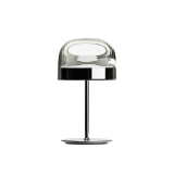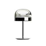 Equatore is a contemporary reinterpretation of the classic lamp with a glass shade. While the traditional lampshade is used to hold the light source inside, in this family of lamps, the lampshade is paradoxically empty, the light being generated by two luminous disks placed inside a central metallic strip, visible on the lampshade, reminiscent of the equator line. The light produced by the LED, via internal screens arranged in layers, is diffused evenly on the surface of the disks, illuminating them as if by magic. The lower disk directs the light downwards, the upper disk illuminates the glass bell for soft, diffused light. Edited by