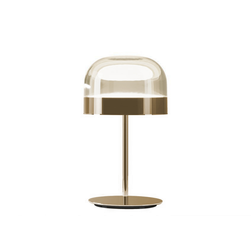 Equatore is a contemporary reinterpretation of the classic lamp with a glass shade. While the traditional lampshade is used to hold the light source inside, in this family of lamps, the lampshade is paradoxically empty, the light being generated by two luminous disks placed inside a central metallic strip, visible on the lampshade, reminiscent of the equator line. The light produced by the LED, via internal screens arranged in layers, is diffused evenly on the surface of the disks, illuminating them as if by magic. The lower disk directs the light downwards, the upper disk illuminates the glass bell for soft, diffused light. Edited by