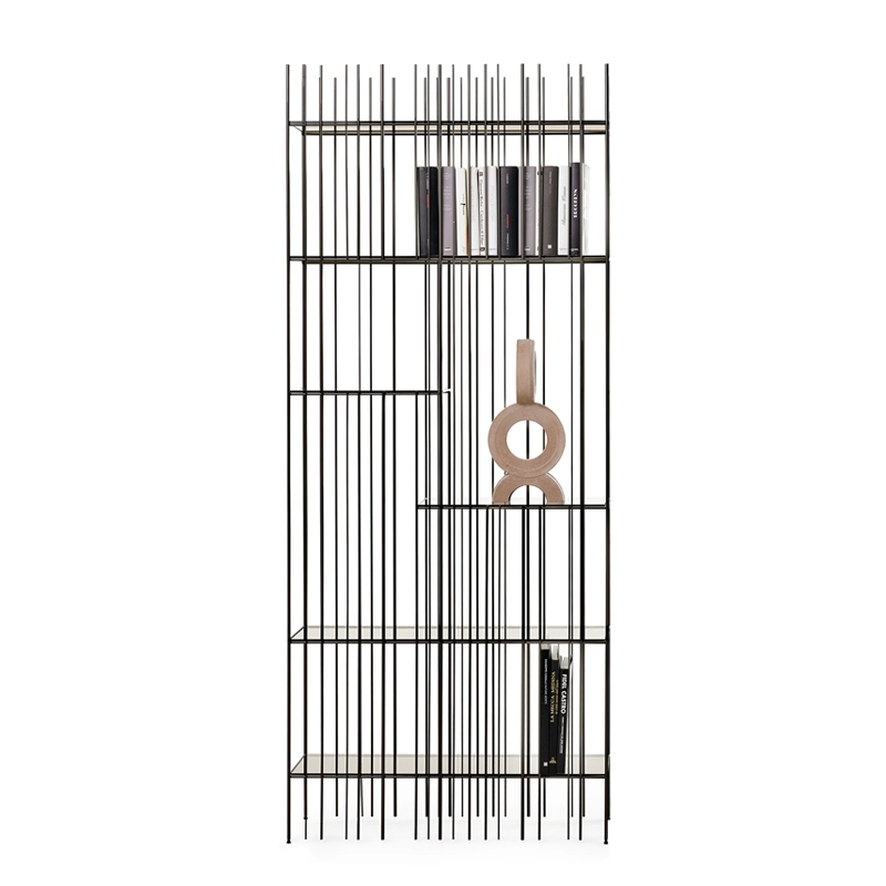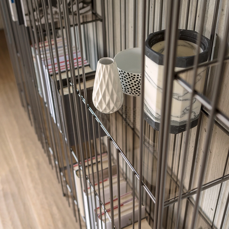 Metrica, the rhythm is marked by metal rods fixed at different intervals to a rigorous structure. The books and objects that are placed there complete the final shape and look. Thanks to its composition of metal rods and glass,