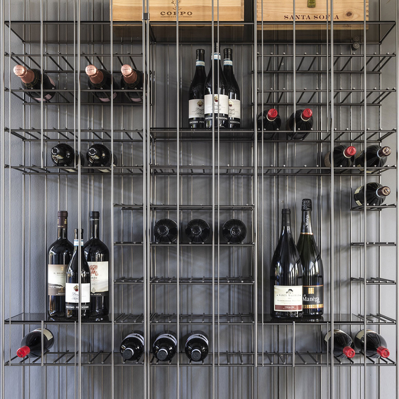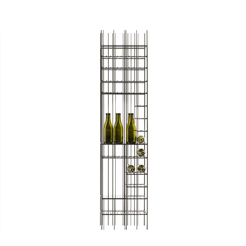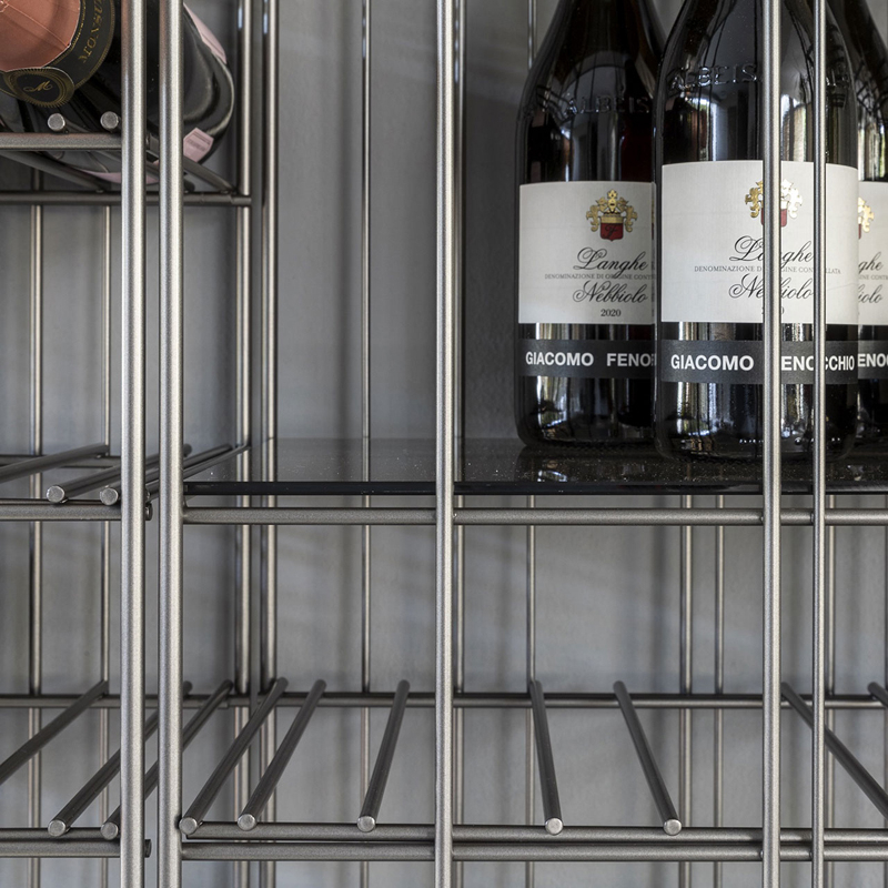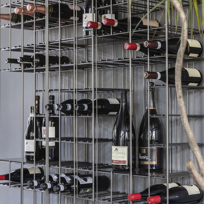 With Metrica Wine, the rhythm is marked by metal rods fixed at different intervals to a rigorous structure. The bottles and objects that sit on them complete the final shape and look.