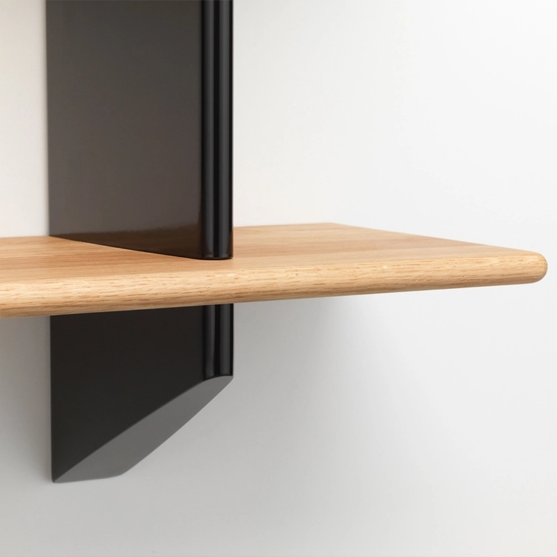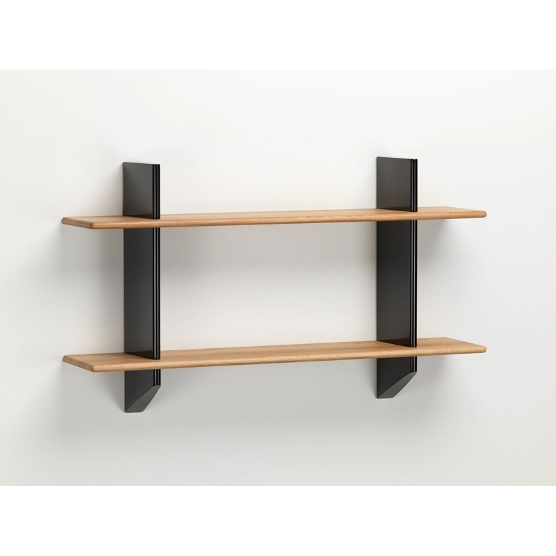 Wall-mounted bookcases were common in interiors in the first half of the 20th century. Jean Prouvé also designed a number of wall shelves, such as the Rayonnage Mural, originally designed in 1936 for the École nationale professionnelle de la ville de Metz. Reissued by Vitra, Rayonnage Mural is a simple, elegant shelf featuring two vertical wall brackets whose aerodynamic shape is reminiscent of the rudder of a plane or ship. A recurring feature of Prouvé's creations, these metal supports feature precision-crafted horizontal slots into which the solid wood shelves are inserted. Together, these two high-contrast materials create a practical shelf with the sculptural qualities of an aesthetic object. Available in a range of finishes, this wall-mounted shelf will look great in any living room, bedroom or kitchen.