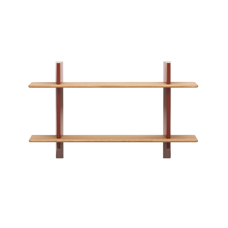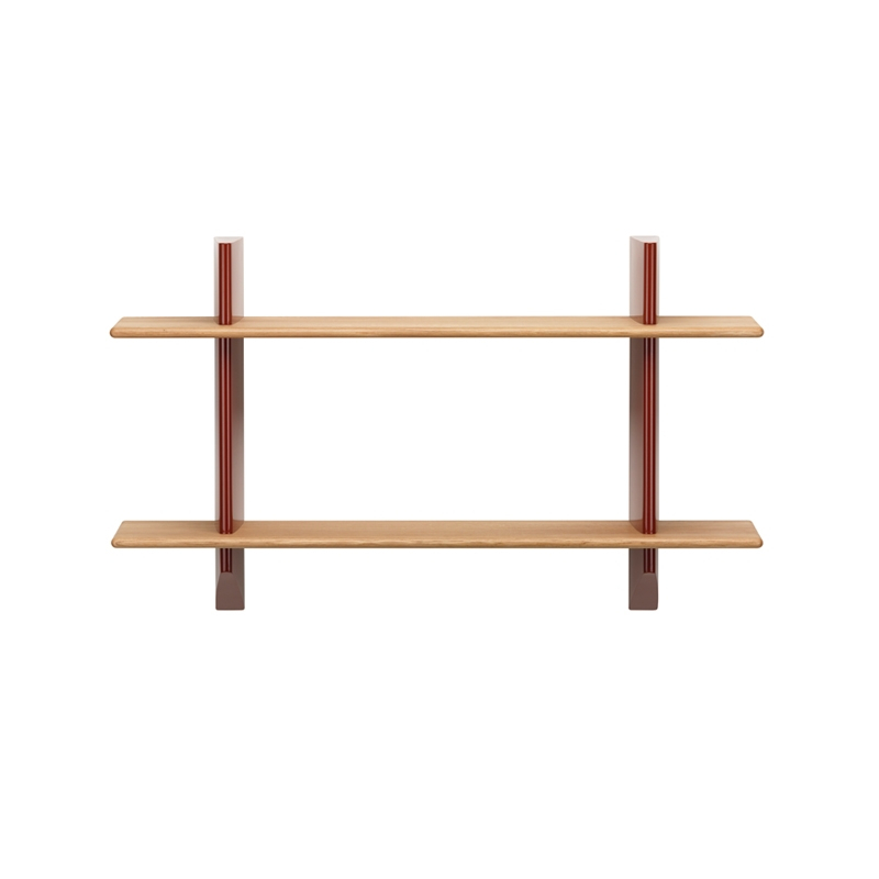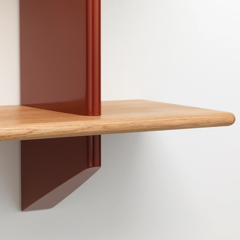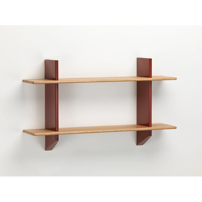 Wall-mounted bookcases were common in interiors in the first half of the 20th century. Jean Prouvé also designed a number of wall shelves, such as the Rayonnage Mural, originally designed in 1936 for the École nationale professionnelle de la ville de Metz. Reissued by Vitra, Rayonnage Mural is a simple, elegant shelf featuring two vertical wall brackets whose aerodynamic shape is reminiscent of the rudder of a plane or ship. A recurring feature of Prouvé's creations, these metal supports feature precision-crafted horizontal slots into which the solid wood shelves are inserted. Together, these two high-contrast materials create a practical shelf with the sculptural qualities of an aesthetic object. Available in a range of finishes, this wall-mounted shelf will look great in any living room, bedroom or kitchen.
