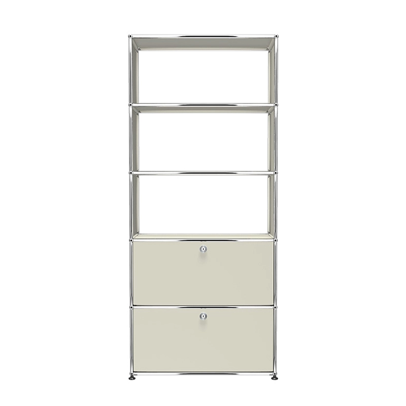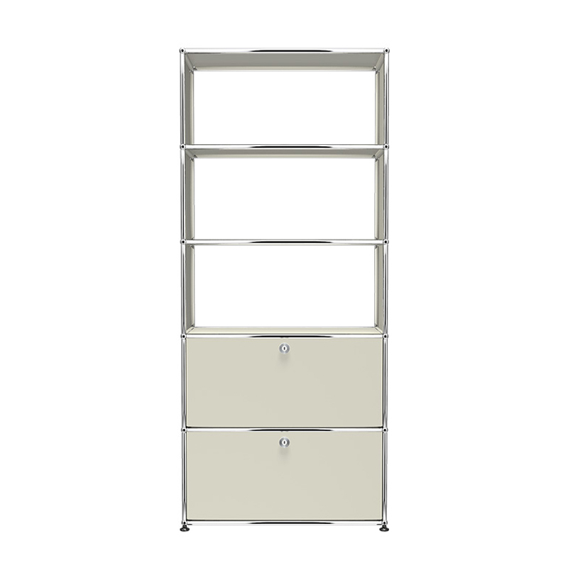 The meuble Haller M24 has three open shelves and two folding doors. The meuble Haller M24 has a chrome-plated steel structure assembled by connecting balls, clad in powder-coated steel panels and mounted on height-adjustable glides.  Classic doors that don't require keys. (Secure on delivery, the doors unlock for the first time using a coin or a normal key)