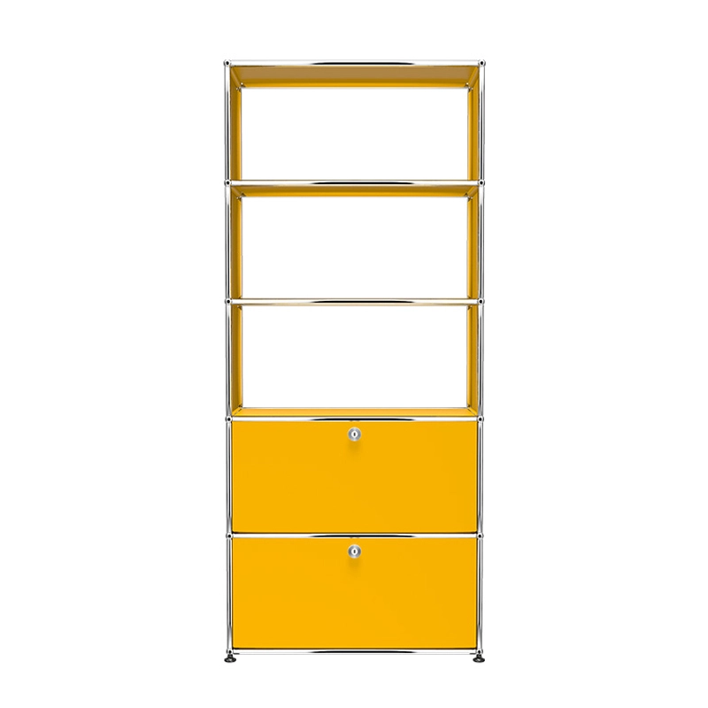 The meuble Haller M24 has three open shelves and two folding doors. The meuble Haller M24 has a chrome-plated steel structure assembled by connecting balls, clad in powder-coated steel panels and mounted on height-adjustable glides.  Classic doors that don't require keys. (Secure on delivery, the doors unlock for the first time using a coin or a normal key)