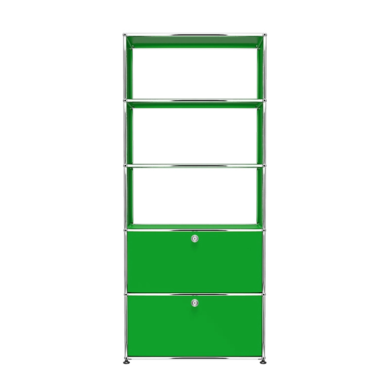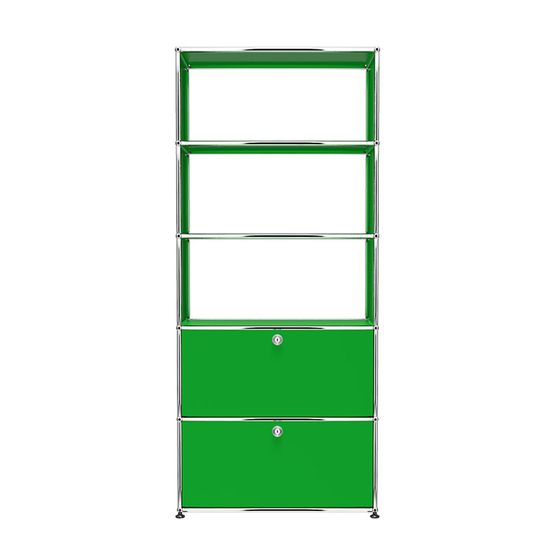 The meuble Haller M24 has three open shelves and two folding doors. The meuble Haller M24 has a chrome-plated steel structure assembled by connecting balls, clad in powder-coated steel panels and mounted on height-adjustable glides.  Classic doors that don't require keys. (Secure on delivery, the doors unlock for the first time using a coin or a normal key)