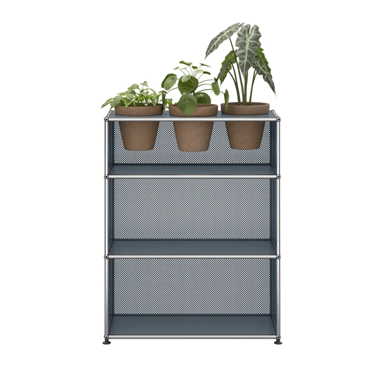 Created by architect Fritz Haller and visionary industrialist Paul Schärer, USM furniture has been made in Switzerland for over 50 years and is recognised the world over. The build quality of USM HALLER furniture and its timeless lines make it an essential design classic, equally at home in offices and the most beautiful interiors, whether classic or modern. Its modular design means that it can be upgraded over time as needs and desires change. The Haller M56 shelf has a chrome-plated steel structure assembled by connecting balls, clad in powder-coated steel panels and mounted on height-adjustable glides. The Haller M56 USM shelf comes with 3 pots* for your indoor plants, as well as a watering kit per pot. The kit guarantees regular watering for your plants. Plants and substrate are not supplied. * The finish of the pots is automatically coordinated with the colour of the panels:
