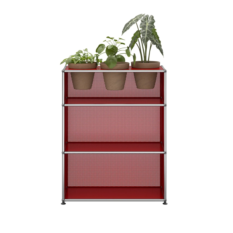 Created by architect Fritz Haller and visionary industrialist Paul Schärer, USM furniture has been made in Switzerland for over 50 years and is recognised the world over. The build quality of USM HALLER furniture and its timeless lines make it an essential design classic, equally at home in offices and the most beautiful interiors, whether classic or modern. Its modular design means that it can be upgraded over time as needs and desires change. The Haller M56 shelf has a chrome-plated steel structure assembled by connecting balls, clad in powder-coated steel panels and mounted on height-adjustable glides. The Haller M56 USM shelf comes with 3 pots* for your indoor plants, as well as a watering kit per pot. The kit guarantees regular watering for your plants. Plants and substrate are not supplied. * The finish of the pots is automatically coordinated with the colour of the panels: