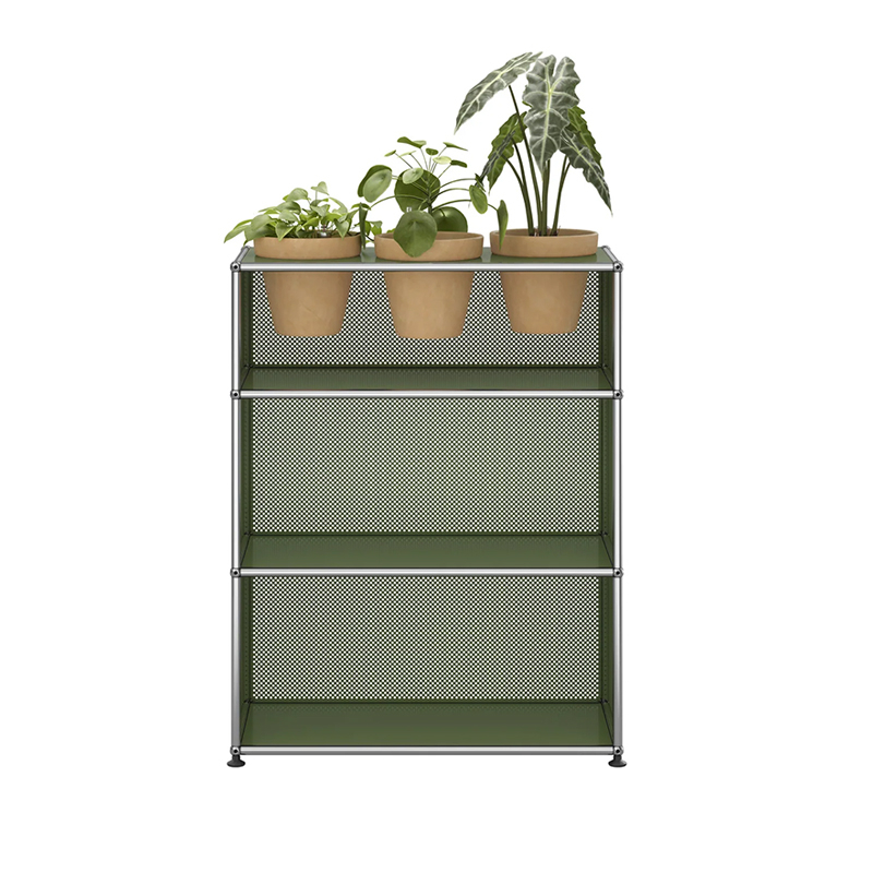 Created by architect Fritz Haller and visionary industrialist Paul Schärer, USM furniture has been made in Switzerland for over 50 years and is recognised the world over. The build quality of USM HALLER furniture and its timeless lines make it an essential design classic, equally at home in offices and the most beautiful interiors, whether classic or modern. Its modular design means that it can be upgraded over time as needs and desires change. The Haller M56 shelf has a chrome-plated steel structure assembled by connecting balls, clad in powder-coated steel panels and mounted on height-adjustable glides. The Haller M56 USM shelf comes with 3 pots* for your indoor plants, as well as a watering kit per pot. The kit guarantees regular watering for your plants. Plants and substrate are not supplied. * The finish of the pots is automatically coordinated with the colour of the panels: