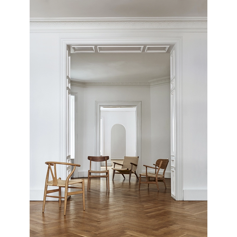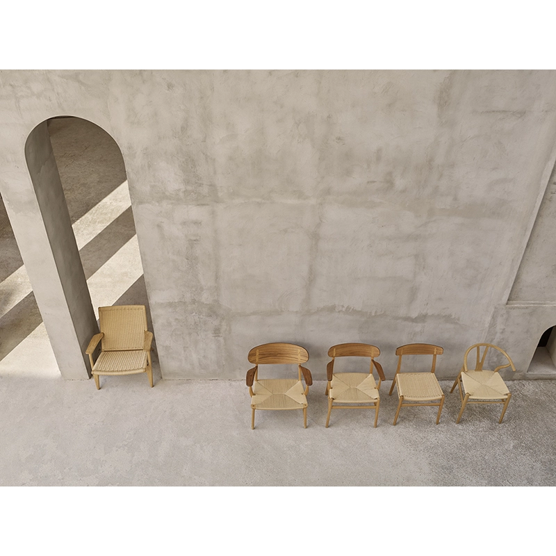 The CH25 armchair is one of the first chairs created exclusively by Hans J. Wegner for Carl Hansen. Like many of Hans J. Wegner's iconic designs, the CH25 armchair is clean and simple, yet with a distinctive shape. But its presentation caused a sensation because of the choice of materials for the backrest and seat. Woven paper rope, designed to replace sea rush during the Second World War, had not previously been used for furniture. However, Wegner was enthusiastic about the material's appearance, non-stretch properties and optimum durability. The CH25 armchair has remained extremely popular, still produced by Carl Hansen since 1950: a testament to Wegner's visionary approach. It takes a skilled craftsman 10 hours and around 400 metres of paper rope to make a seat and backrest by hand, using a special technique resembling weaving, which is visible on both sides of the backrest.