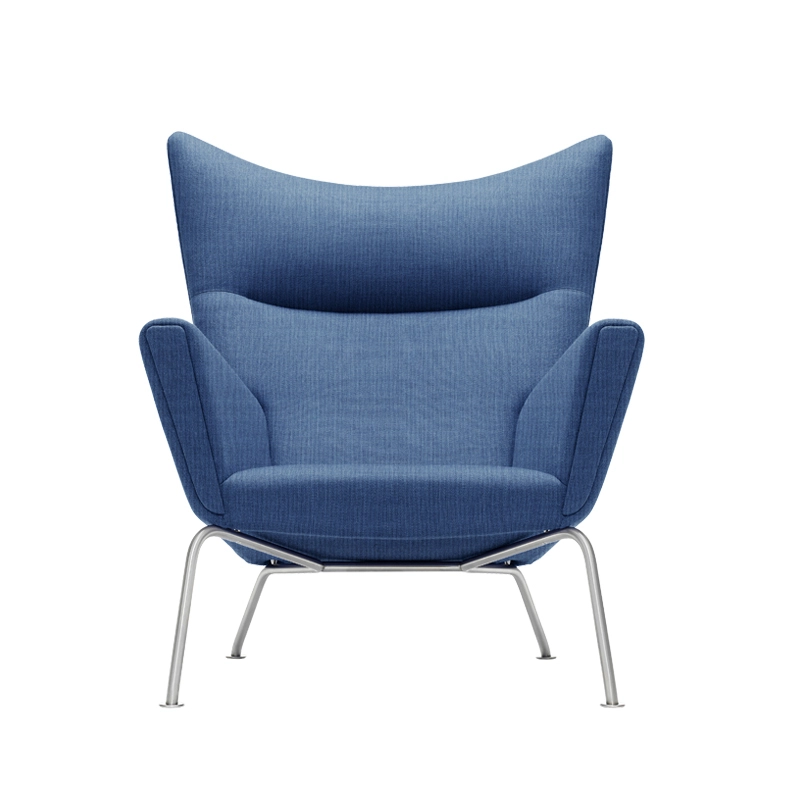TheCH445 armchair by Hans J. Wegner for Carl Hansen, also known as the Wing Chair, is a fully upholstered armchair that rests on a stainless steel frame. The chair, with its distinctive lines and pleasant seating comfort, is a fine example of what Wegner believes a high-back chair should be. Underneath the upholstery is a solid beech frame for strength and durability. The precise shape and density of the upholstery are carefully chosen to give the best possible support to all parts of the body. The seat and backrest of CH445 are designed to provide comfortable support for the back, shoulders, neck and head in different sitting positions. The slim, rounded stainless steel frame features slightly sloping front legs, while the rear legs project well back so that the chair does not tip over despite its reclined position. Four small cone-shaped steel elements connect the top of the chair to the frame. The Wing Chair CH445 was designed in 1960 and only a few examples had been produced. Carl Hansen & Søn relaunched the chair in 2006.