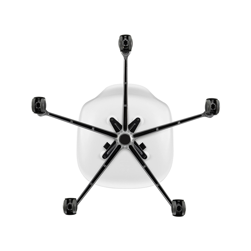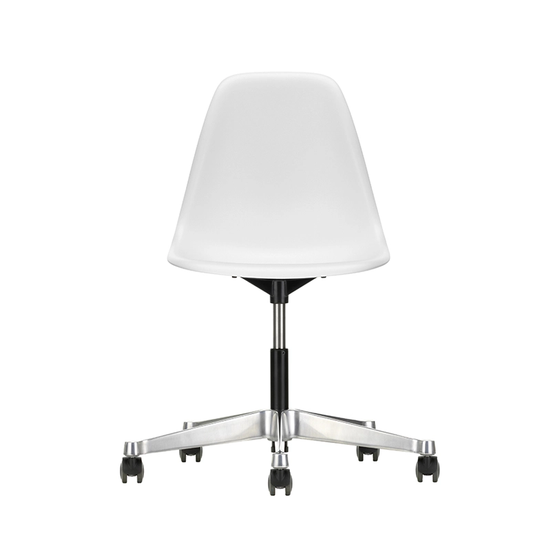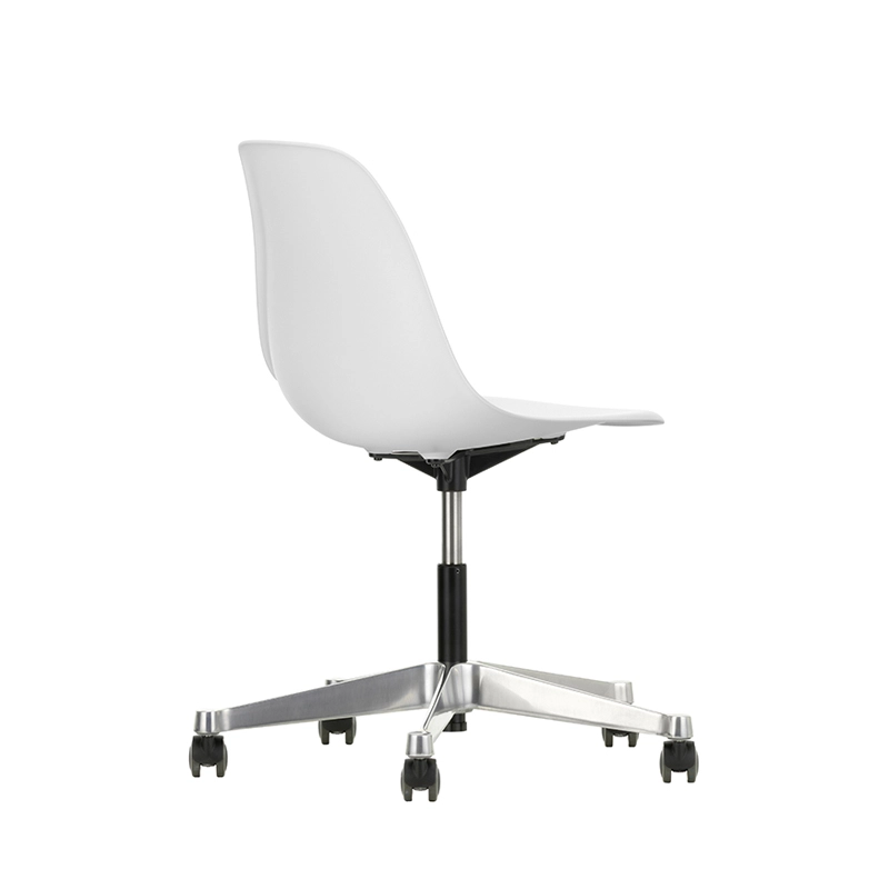 The Eames Plastic Side Chair is the updated version of the legendary Fiberglass Chair by Charles and Ray Eames. Designed in collaboration with Zenith Plastics for the 'Low Cost Furniture Design' competition at the Museum of Modern Art in New York in 1950, it was the first industrially manufactured plastic chair. Produced by Vitra, the Eames Plastic Chair PSCC (Pivot Sidechair Cast base on Castors) is equipped with castors. The organic lines of the shell, which provides excellent comfort, combined with the swivel base transform the Side Chair into an office chair.