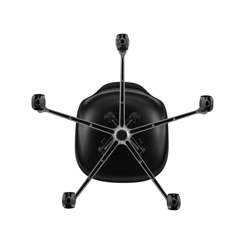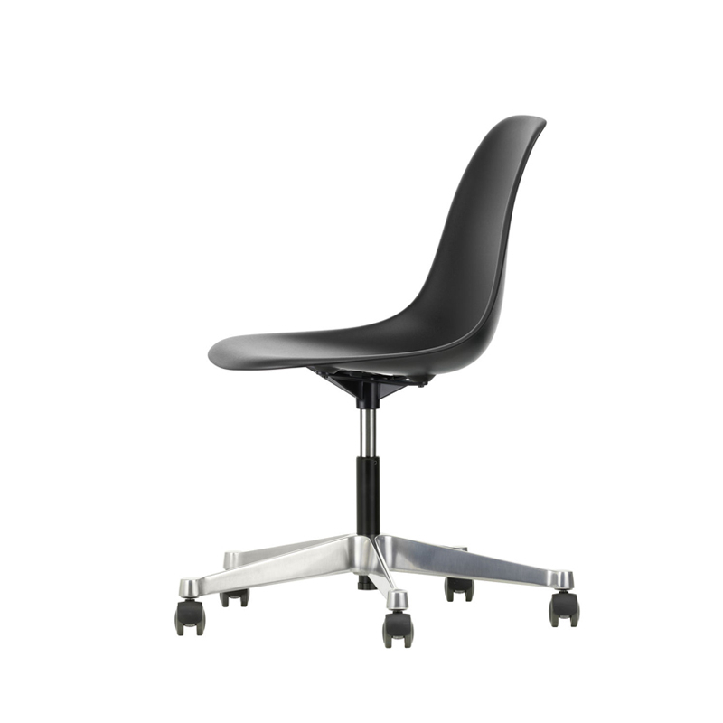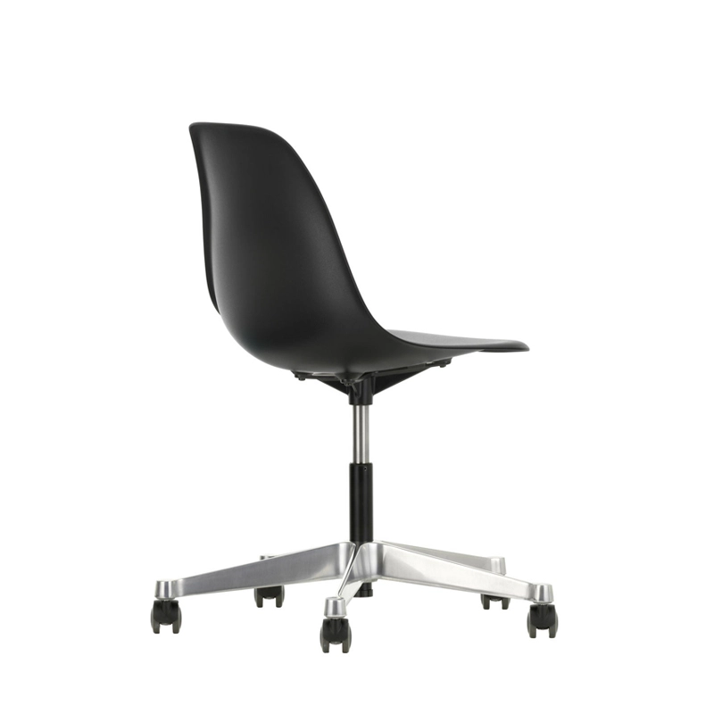 The Eames Plastic Side Chair is the updated version of the legendary Fiberglass Chair by Charles and Ray Eames. Designed in collaboration with Zenith Plastics for the 'Low Cost Furniture Design' competition at the Museum of Modern Art in New York in 1950, it was the first industrially manufactured plastic chair. Produced by Vitra, the Eames Plastic Chair PSCC (Pivot Sidechair Cast base on Castors) is equipped with castors. The organic lines of the shell, which provides excellent comfort, combined with the swivel base transform the Side Chair into an office chair.