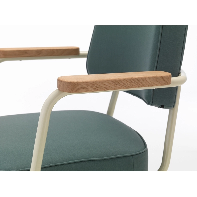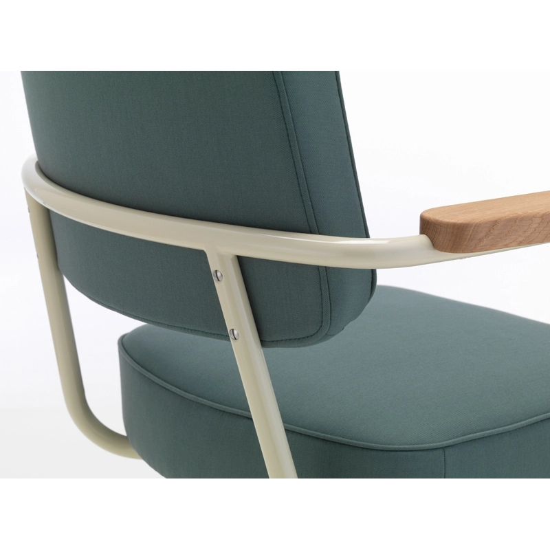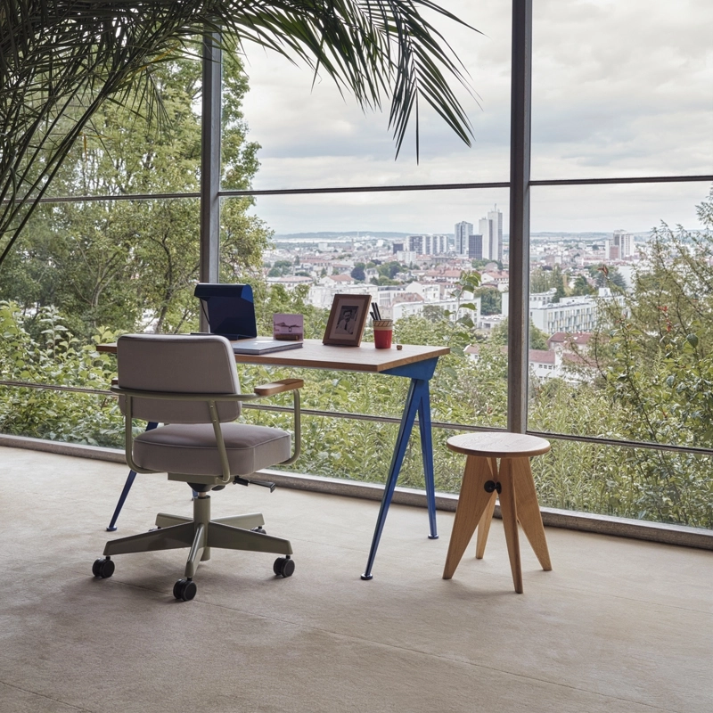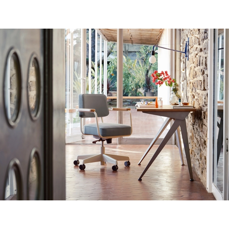 Designed in 1951 by French designer Jean Prouvé, the Fauteuil Direction Pivotant is still as relevant today thanks to its characteristic aesthetic and functional requirements. Published by Vitra, it features a generous upholstered seat and backrest, resting on an elegant frame made from tubular steel and folded sheet metal. The wooden armrests give the office chair a touch of familiar comfort.